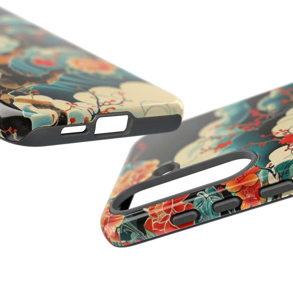 Dit ontwerp toont een gestileerde tak met oranje en rode bloemen, tegen een sfeervolle achtergrond van draaiende wolken en een grote oranje maan. De bloemen zijn rijk gedetailleerd met groene bladeren, terwijl de wolken in zachte crème- en groentinten zijn weergegeven. De donkere achtergrond laat de levendige bloemen extra opvallen. De afbeelding is gedrukt op een glanzend, stevig hoesje van polycarbonaat en TPU, dat dubbele bescherming biedt en geschikt is voor draadloos opladen.