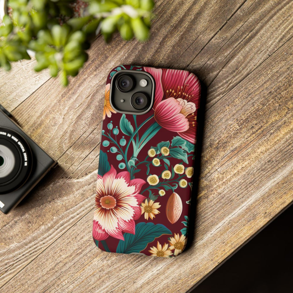 Dit hoesje heeft een rijk bloemenpatroon met grote, gedetailleerde bloemen in tinten roze, crème en oranje. De bloemen worden omringd door bladeren in teal en groen, aangevuld met kleine gele bloesems op een dieprode achtergrond. De illustratiestijl is decoratief en elegant, en het naadloze patroon zorgt voor een harmonieuze uitstraling. Het hoesje bestaat uit twee lagen met een matte afwerking en is gemaakt van polycarbonaat en TPU voor stevigheid en bescherming. Ondersteunt draadloos opladen.