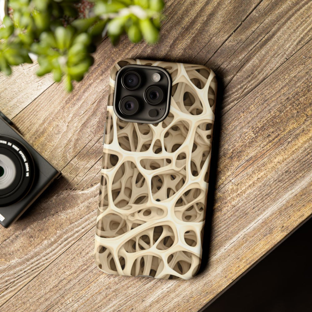 Dit telefoonhoesje heeft een opvallend patroon dat doet denken aan een botstructuur, met onderling verbonden, onregelmatig gevormde openingen en vloeiende randen. De hoofdkleur is beige met subtiele schaduwen die het ontwerp diepte en karakter geven. De afbeelding is gedrukt op een glanzend, stevig hoesje met een dubbele laag van een polycarbonaat buitenkant en een TPU binnenzijde, wat zorgt voor extra stevigheid en bescherming. Het hoesje ondersteunt draadloos opladen, is bestand tegen weersinvloeden en behoudt langdurig zijn heldere uitstraling.