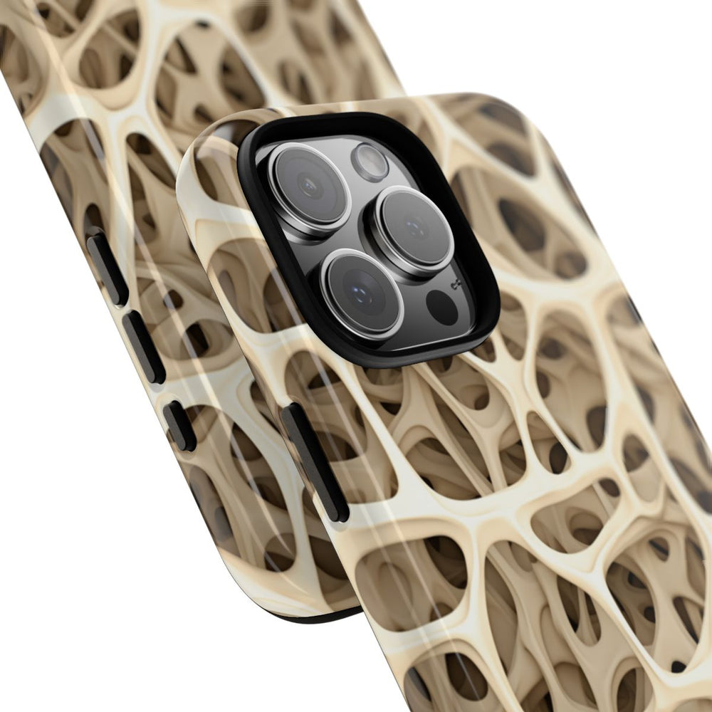Dit telefoonhoesje heeft een opvallend patroon dat doet denken aan een botstructuur, met onderling verbonden, onregelmatig gevormde openingen en vloeiende randen. De hoofdkleur is beige met subtiele schaduwen die het ontwerp diepte en karakter geven. De afbeelding is gedrukt op een glanzend, stevig hoesje met een dubbele laag van een polycarbonaat buitenkant en een TPU binnenzijde, wat zorgt voor extra stevigheid en bescherming. Het hoesje ondersteunt draadloos opladen, is bestand tegen weersinvloeden en behoudt langdurig zijn heldere uitstraling.