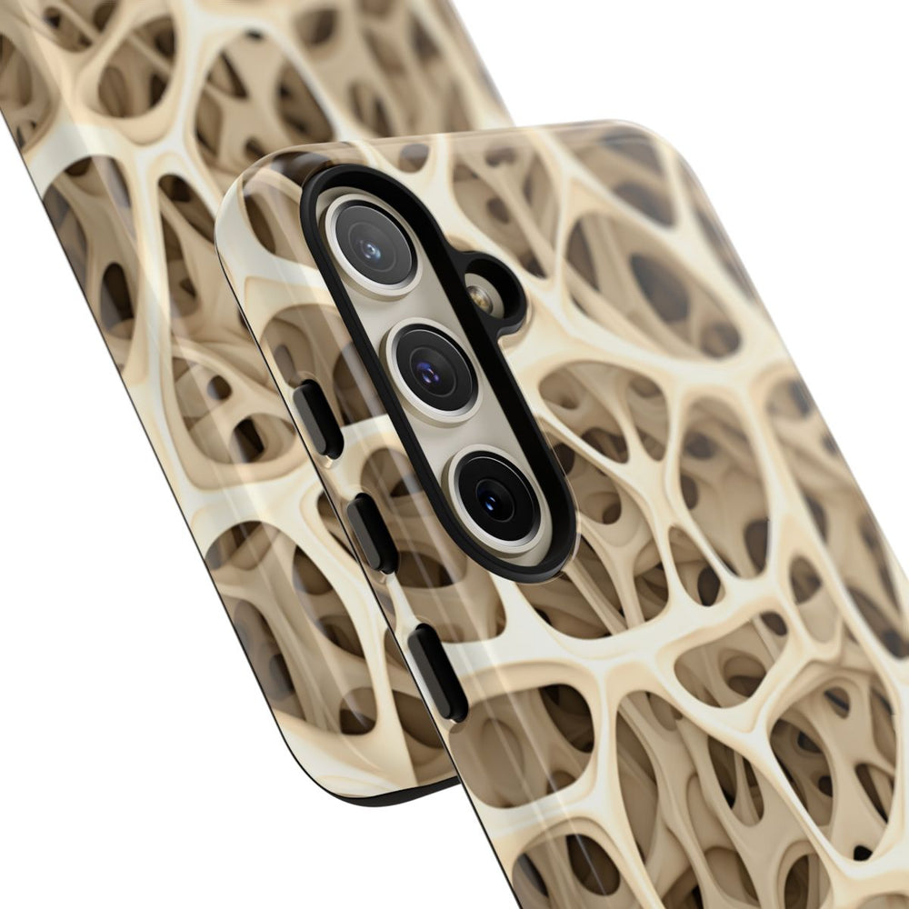 Dit telefoonhoesje heeft een opvallend patroon dat doet denken aan een botstructuur, met onderling verbonden, onregelmatig gevormde openingen en vloeiende randen. De hoofdkleur is beige met subtiele schaduwen die het ontwerp diepte en karakter geven. De afbeelding is gedrukt op een glanzend, stevig hoesje met een dubbele laag van een polycarbonaat buitenkant en een TPU binnenzijde, wat zorgt voor extra stevigheid en bescherming. Het hoesje ondersteunt draadloos opladen, is bestand tegen weersinvloeden en behoudt langdurig zijn heldere uitstraling.