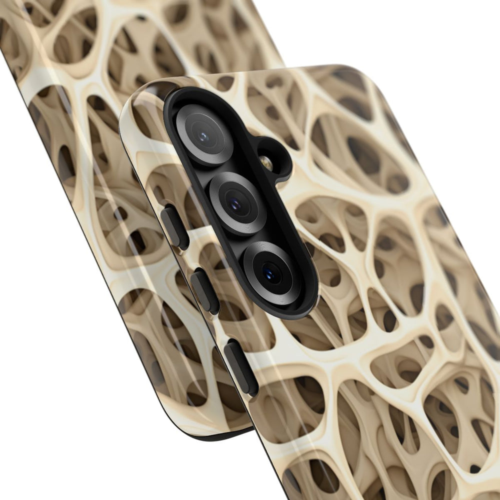 Dit telefoonhoesje heeft een opvallend patroon dat doet denken aan een botstructuur, met onderling verbonden, onregelmatig gevormde openingen en vloeiende randen. De hoofdkleur is beige met subtiele schaduwen die het ontwerp diepte en karakter geven. De afbeelding is gedrukt op een glanzend, stevig hoesje met een dubbele laag van een polycarbonaat buitenkant en een TPU binnenzijde, wat zorgt voor extra stevigheid en bescherming. Het hoesje ondersteunt draadloos opladen, is bestand tegen weersinvloeden en behoudt langdurig zijn heldere uitstraling.