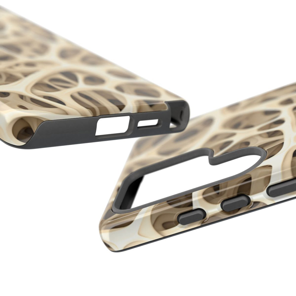 Dit telefoonhoesje heeft een opvallend patroon dat doet denken aan een botstructuur, met onderling verbonden, onregelmatig gevormde openingen en vloeiende randen. De hoofdkleur is beige met subtiele schaduwen die het ontwerp diepte en karakter geven. De afbeelding is gedrukt op een glanzend, stevig hoesje met een dubbele laag van een polycarbonaat buitenkant en een TPU binnenzijde, wat zorgt voor extra stevigheid en bescherming. Het hoesje ondersteunt draadloos opladen, is bestand tegen weersinvloeden en behoudt langdurig zijn heldere uitstraling.