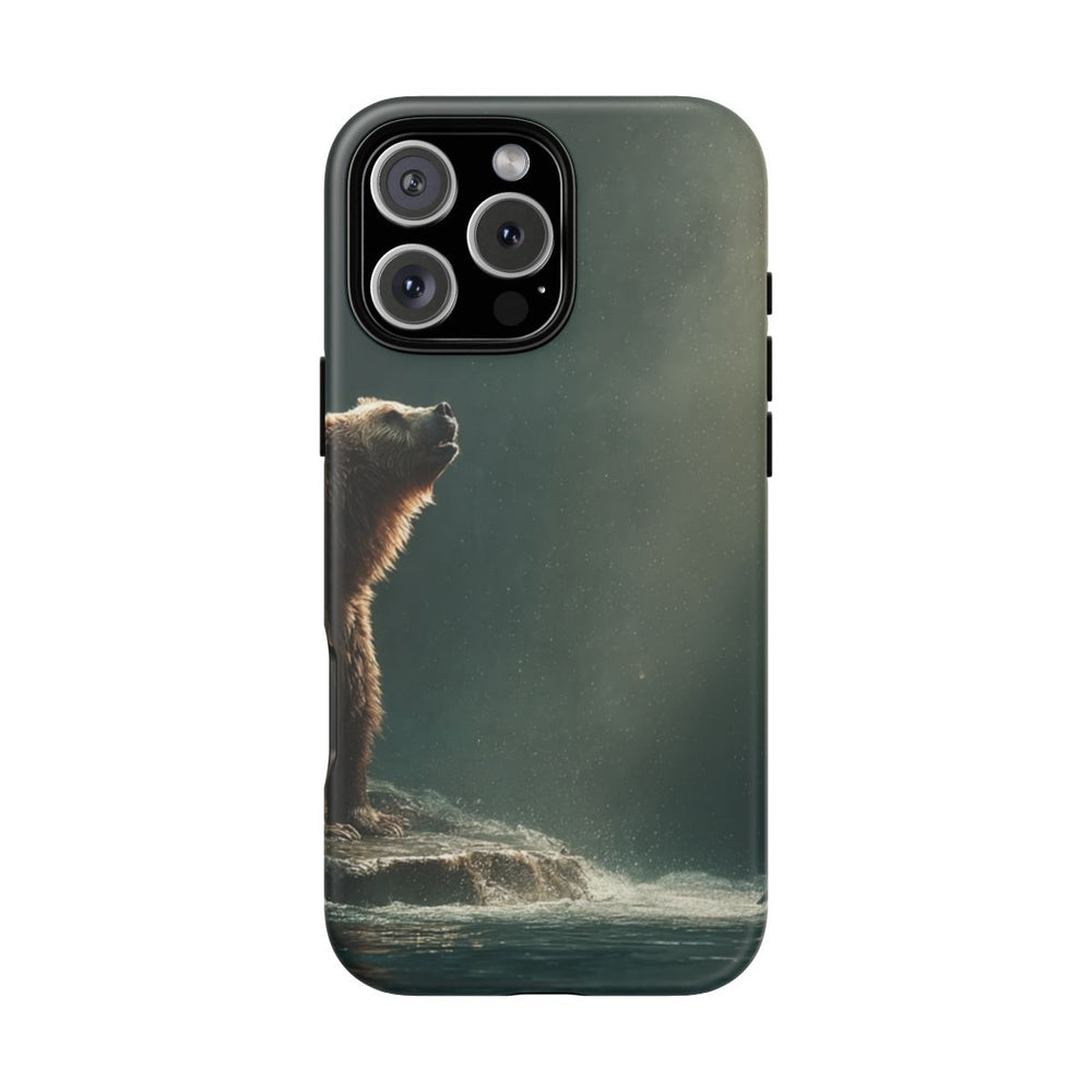 Dit telefoonhoesje toont een bruine beer die op een rots aan de oever van een stromende rivier zit. De beer kijkt omhoog naar een lichtstraal die door een donkere, rotsachtige achtergrond schijnt. In het water vlakbij de beer zwemt een zalm. De afbeelding straalt een natuurlijke en serene sfeer uit, met zacht licht dat de vacht van de beer en het wateroppervlak mooi accentueert. Het hoesje bestaat uit twee lagen met een matte afwerking, een stevige polycarbonaat buitenkant en een TPU-binnenzijde. Het is ontworpen voor extra bescherming en ondersteunt draadloos opladen.