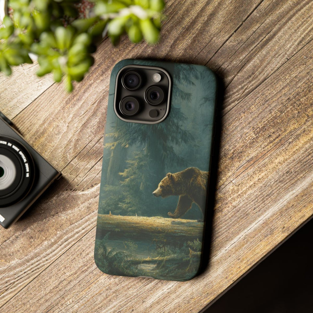 Dit ontwerp toont een bruine beer die over een grote omgevallen boomstam loopt in een dicht bos. Het bos bestaat uit hoge naaldbomen en weelderige varens. Zacht zonlicht schijnt tussen de bomen door en zorgt voor een rustige, natuurlijke sfeer. Het matte hoesje is gemaakt van polycarbonaat met een TPU-voering en biedt stevige bescherming dankzij de dubbele laag. Geschikt voor draadloos opladen.