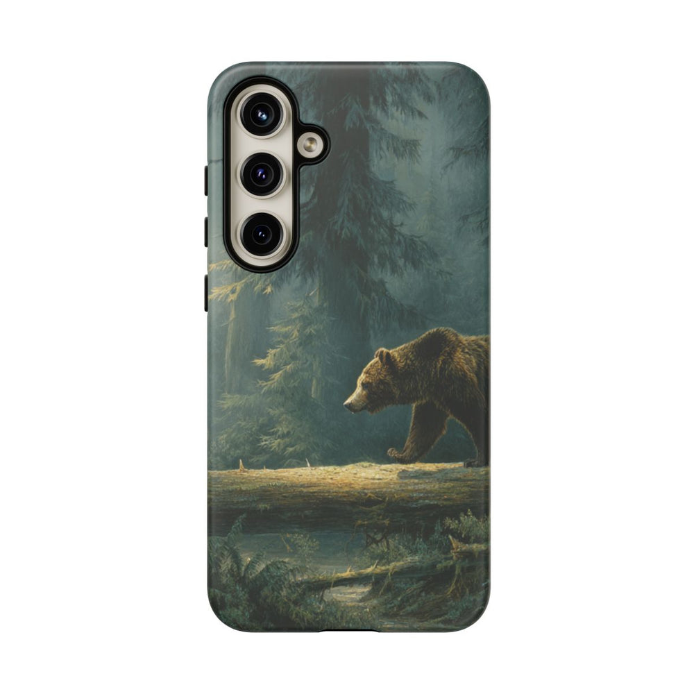 Dit hoesje heeft een afbeelding van een bruine beer die over een grote omgevallen boomstam loopt in een dicht bos. Het bos bestaat uit hoge naaldbomen en weelderige varens, wat zorgt voor een rijke, natuurlijke sfeer. Zacht licht valt door de bomen en zet de beer en delen van de bosgrond in de schijnwerpers. Het hoesje is voorzien van een dubbele laag met een matte afwerking en is gemaakt van polycarbonaat en TPU. Het is stevig, duurzaam en bestand tegen verschillende weersomstandigheden. Draadloos opladen wordt ondersteund, maar het hoesje is niet geschikt voor MagSafe.