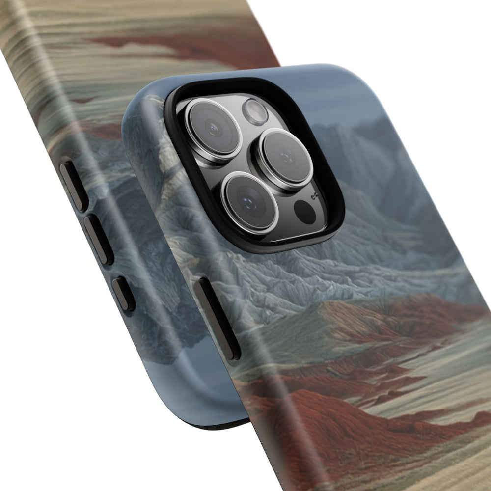Dit telefoonhoesje toont twee donkere buffels die grazen in een uitgestrekt veld met hoog, lichtgroen gras. Rondom het veld liggen opvallende rode heuvels die overgaan in ruige, grijswitte bergen onder een bewolkte lucht. Het ontwerp brengt een rustige, natuurlijke sfeer met een krachtig contrast tussen de rode heuvels en de zachte tinten van gras en bergen. Het hoesje heeft een dubbele laag met een matte afwerking, een stevige polycarbonaat buitenkant en een TPU binnenzijde. Geschikt voor draadloos opladen.