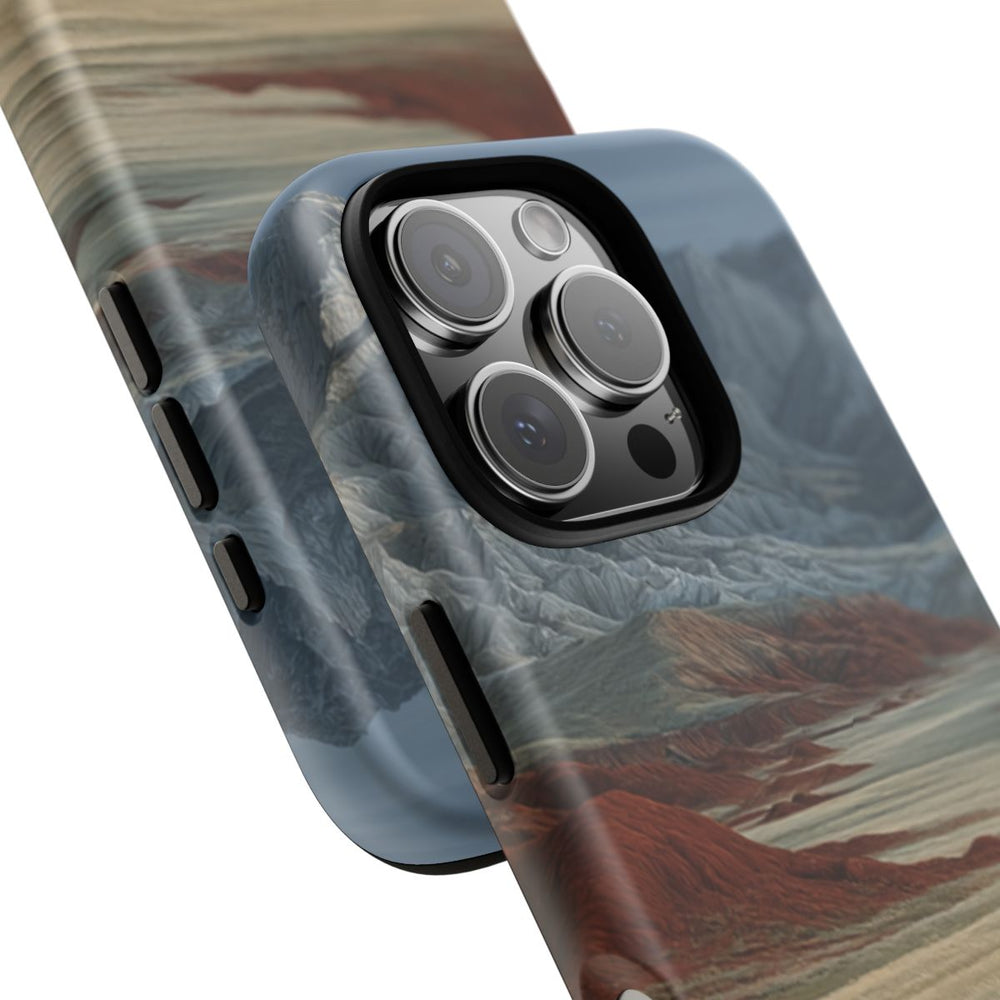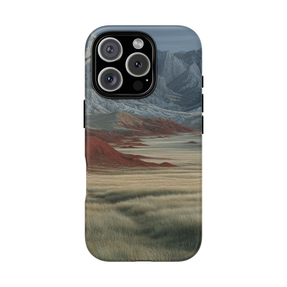 Dit ontwerp toont twee donkere buffels die grazen in een uitgestrekt veld met lichtgroen en beige gras. Aan beide zijden zijn opvallende rode heuvels te zien, met daarachter een ruig berglandschap in grijs en wit onder een dreigende, bewolkte lucht. De afbeelding is gedrukt op een mat telefoonhoesje met een stevige constructie van polycarbonaat en een TPU-voering. Dit hoesje biedt dubbele bescherming en is geschikt voor draadloos opladen.