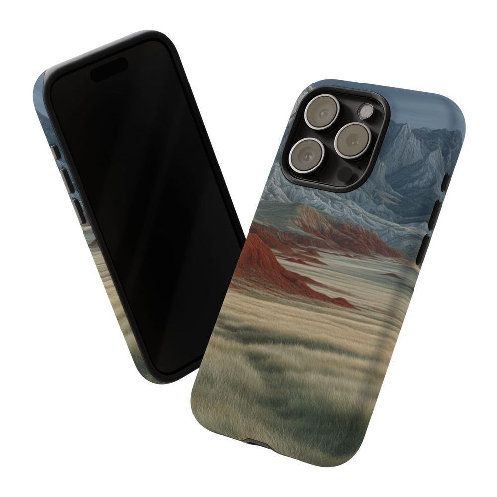 Dit ontwerp toont twee donkere buffels die grazen in een uitgestrekt veld met hoog, lichtgroen gras. Rondom het veld liggen opvallende rode heuvels die mooi contrasteren met de ruige, grijze bergen in de verte onder een sfeervolle blauwgrijze lucht. De afbeelding is bedrukt op een mat telefoonhoesje met dubbele laag, bestaande uit een polycarbonaat buitenkant en een TPU binnenzijde, wat zorgt voor extra stevigheid en bescherming buitenshuis. Ondersteunt draadloos opladen.