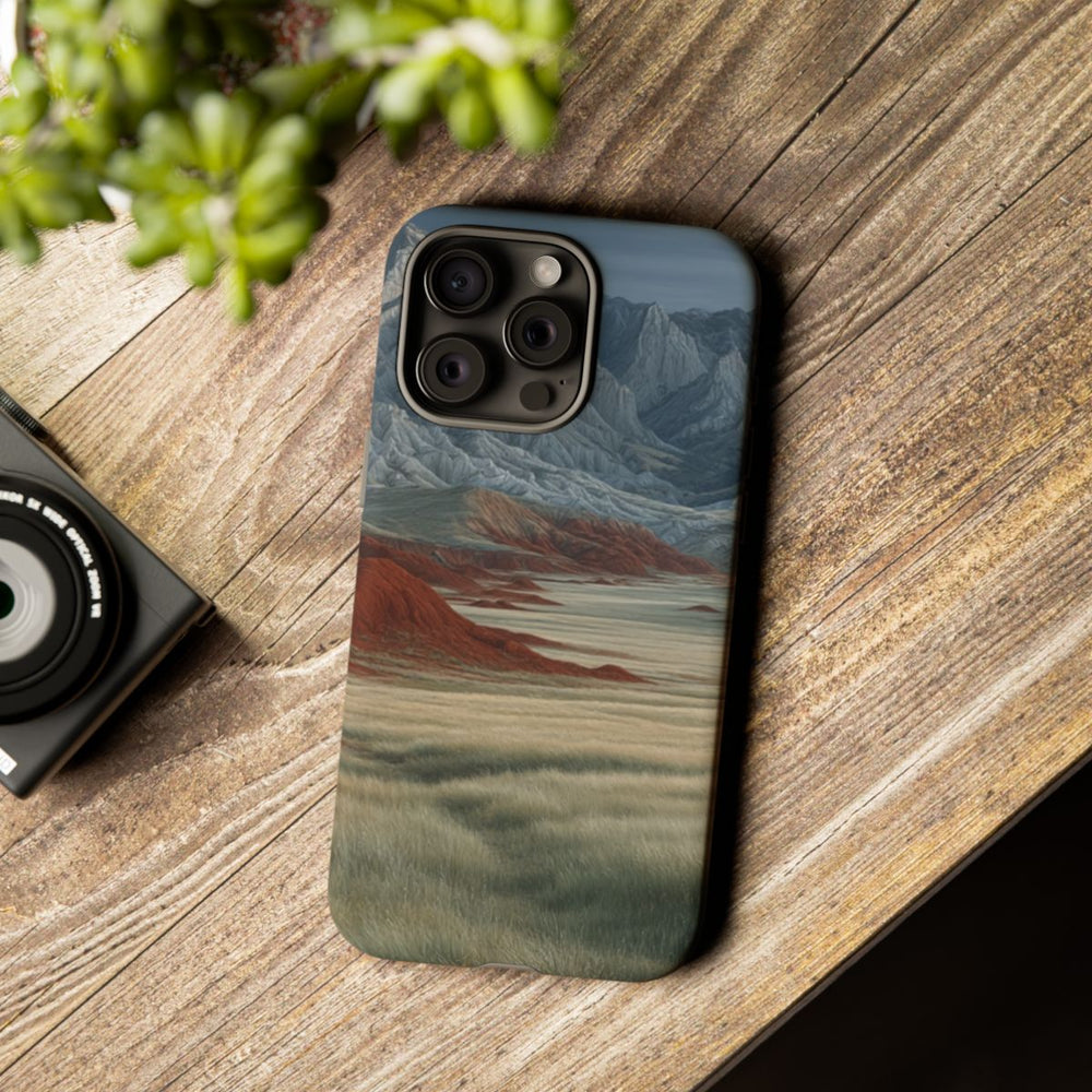 Dit ontwerp toont twee buffels die grazen in een uitgestrekt veld met hoog, groenbeige gras. Rondom het veld liggen opvallende rode heuvels die mooi afsteken tegen de rustige tinten van het gras. Op de achtergrond rijzen robuuste, grijzige bergen op onder een bewolkte lucht. De afbeelding is bedrukt op een matte, stevige hoes met dubbele laag van polycarbonaat en TPU, die je telefoon beschermt en geschikt is voor draadloos opladen.
