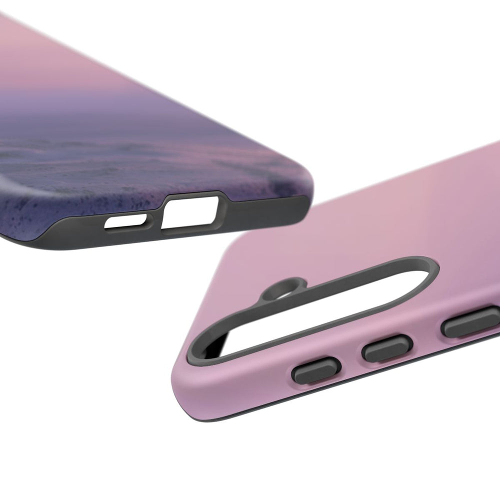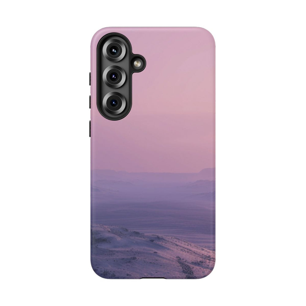 Dit ontwerp toont een uitgestrekt buitenaards landschap onder een zachte violette hemel. Twee heldere zonnen hangen laag aan de horizon en verspreiden een mild licht over glooiende heuvels en verspreide rotsen. De omgeving oogt onaangetast en rustig, met een subtiele overgang in de lucht van licht violet naar zachtroze. De afbeelding is gedrukt op een mat telefoonhoesje met een stevige dubbele laag van polycarbonaat en TPU, wat zorgt voor extra stevigheid en bescherming. Het hoesje ondersteunt draadloos opladen.