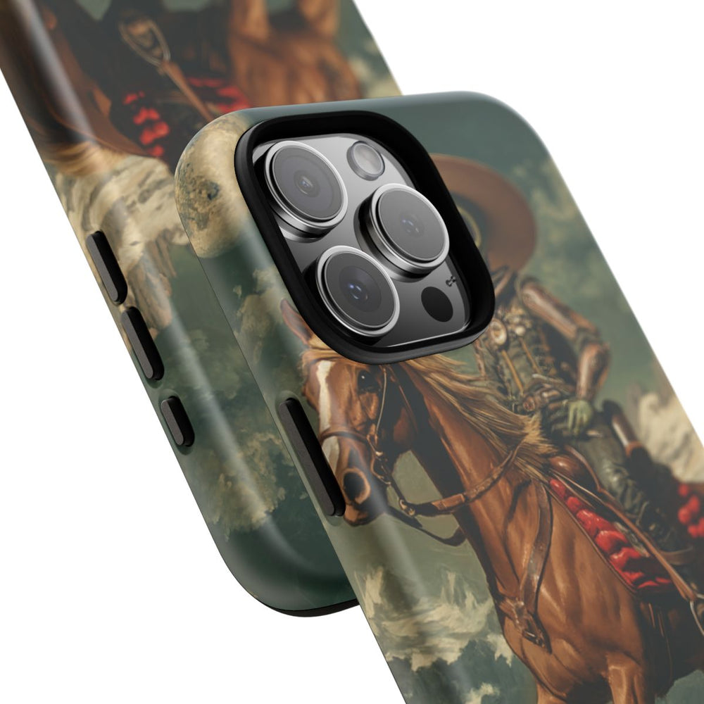 Deze afbeelding toont een groene buitenaardse figuur met grote ogen, gekleed in een opvallende outfit met metalen details en een brede hoed. Hij rijdt op een bruin paard met een rood zadel over een bergpad, omringd door hoge bomen en rotsachtige kliffen. Op de achtergrond is een grote volle maan zichtbaar aan een bewolkte nachtelijke hemel, wat zorgt voor een mysterieuze sfeer. Het hoesje bestaat uit twee lagen: een stevige polycarbonaat buitenkant en een TPU-binnenkant. Geschikt voor draadloos opladen.
