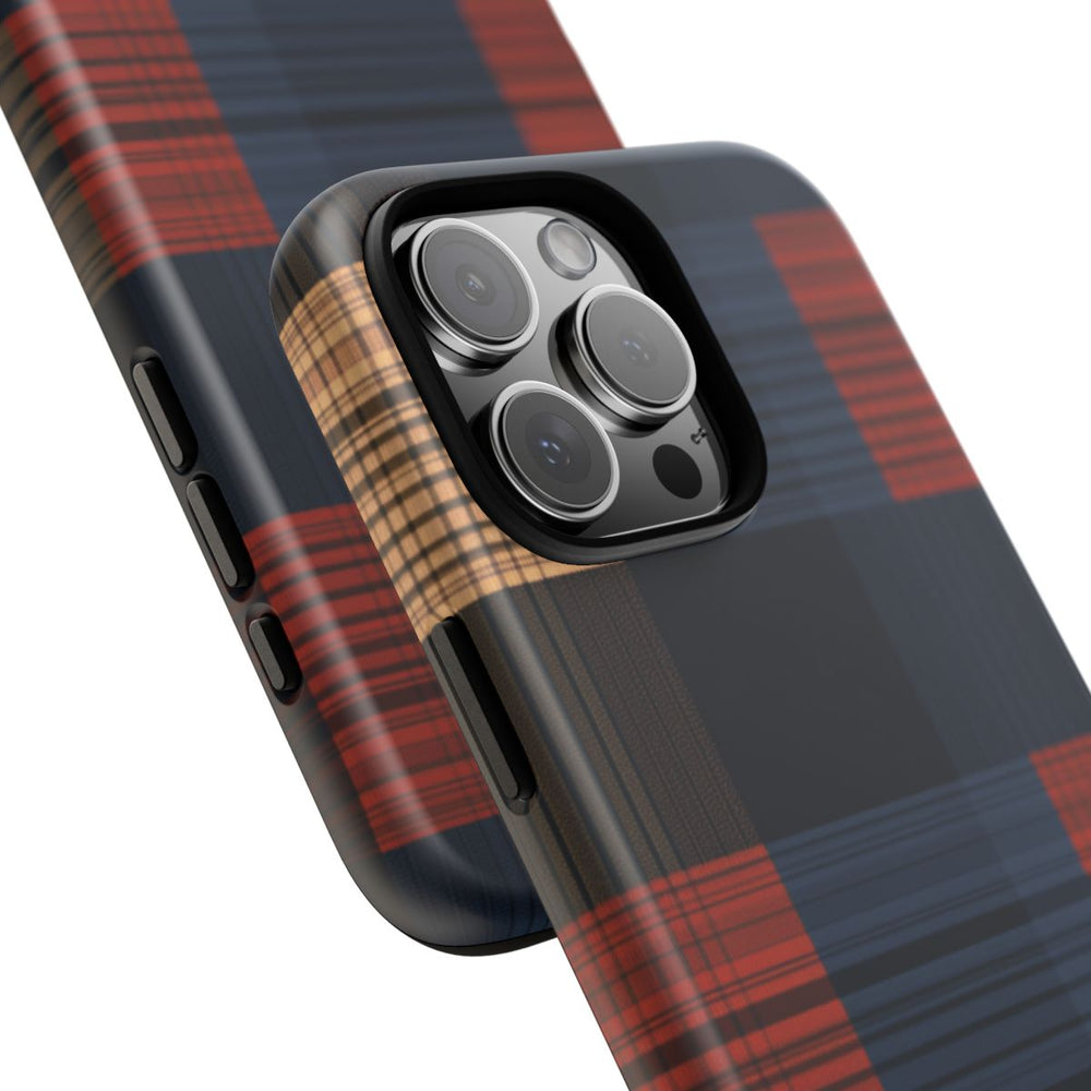 Dit telefoonhoesje is bedrukt met een naadloos geruit patroon in caramel, donkerblauw, rood en bruin. De horizontale en verticale strepen vormen samen vierkanten en rechthoeken in verschillende tinten. De caramel- en rode strepen zorgen voor een warme uitstraling, terwijl donkerblauw en bruin voor een mooi contrast zorgen. Het matte hoesje is gemaakt van polycarbonaat met een TPU-binnenkant en biedt stevige bescherming met twee lagen. Geschikt voor draadloos opladen.