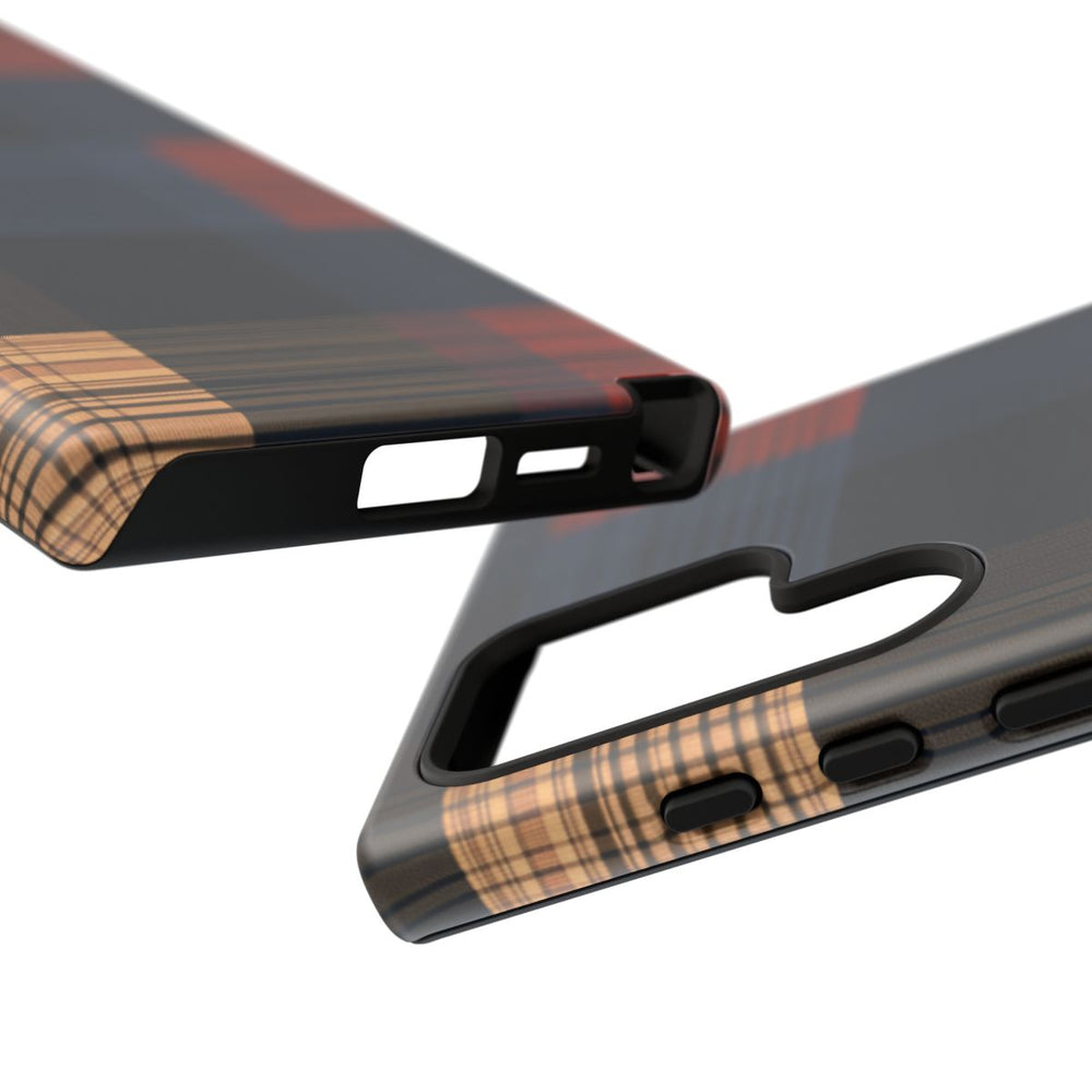 Dit telefoonhoesje is bedrukt met een naadloos geruit patroon in caramel, donkerblauw, rood en bruin. De horizontale en verticale strepen vormen samen vierkanten en rechthoeken in verschillende tinten. De caramel- en rode strepen zorgen voor een warme uitstraling, terwijl donkerblauw en bruin voor een mooi contrast zorgen. Het matte hoesje is gemaakt van polycarbonaat met een TPU-binnenkant en biedt stevige bescherming met twee lagen. Geschikt voor draadloos opladen.
