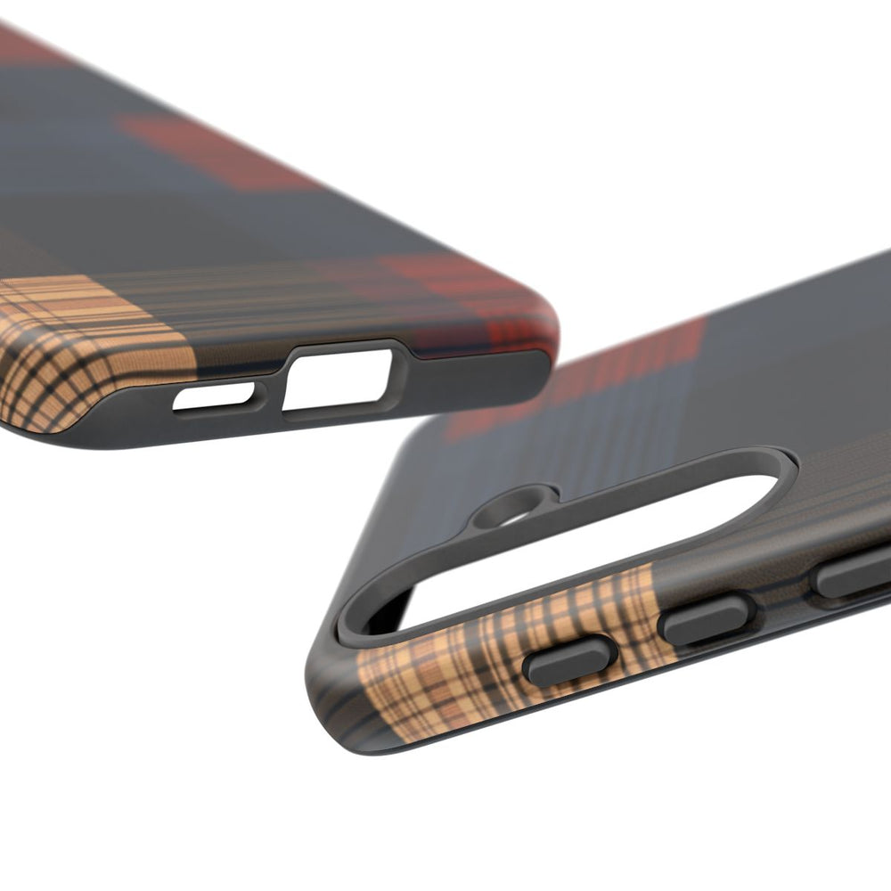 Dit telefoonhoesje is bedrukt met een naadloos geruit patroon in caramel, donkerblauw, rood en bruin. De horizontale en verticale strepen vormen samen vierkanten en rechthoeken in verschillende tinten. De caramel- en rode strepen zorgen voor een warme uitstraling, terwijl donkerblauw en bruin voor een mooi contrast zorgen. Het matte hoesje is gemaakt van polycarbonaat met een TPU-binnenkant en biedt stevige bescherming met twee lagen. Geschikt voor draadloos opladen.