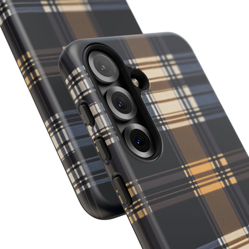 Dit telefoonhoesje heeft een naadloos ruitpatroon in karamel, donkerblauw, lichtblauw en crème. De horizontale en verticale lijnen kruisen elkaar en geven het hoesje een klassieke tartan-uitstraling. Het hoesje bestaat uit twee lagen: een stevige buitenkant van polycarbonaat en een schokabsorberende TPU-voering. Dit zorgt voor extra stevigheid en bescherming. Het hoesje ondersteunt draadloos opladen en is bestand tegen invloeden van buitenaf, waardoor het zijn mooie uitstraling langdurig behoudt.