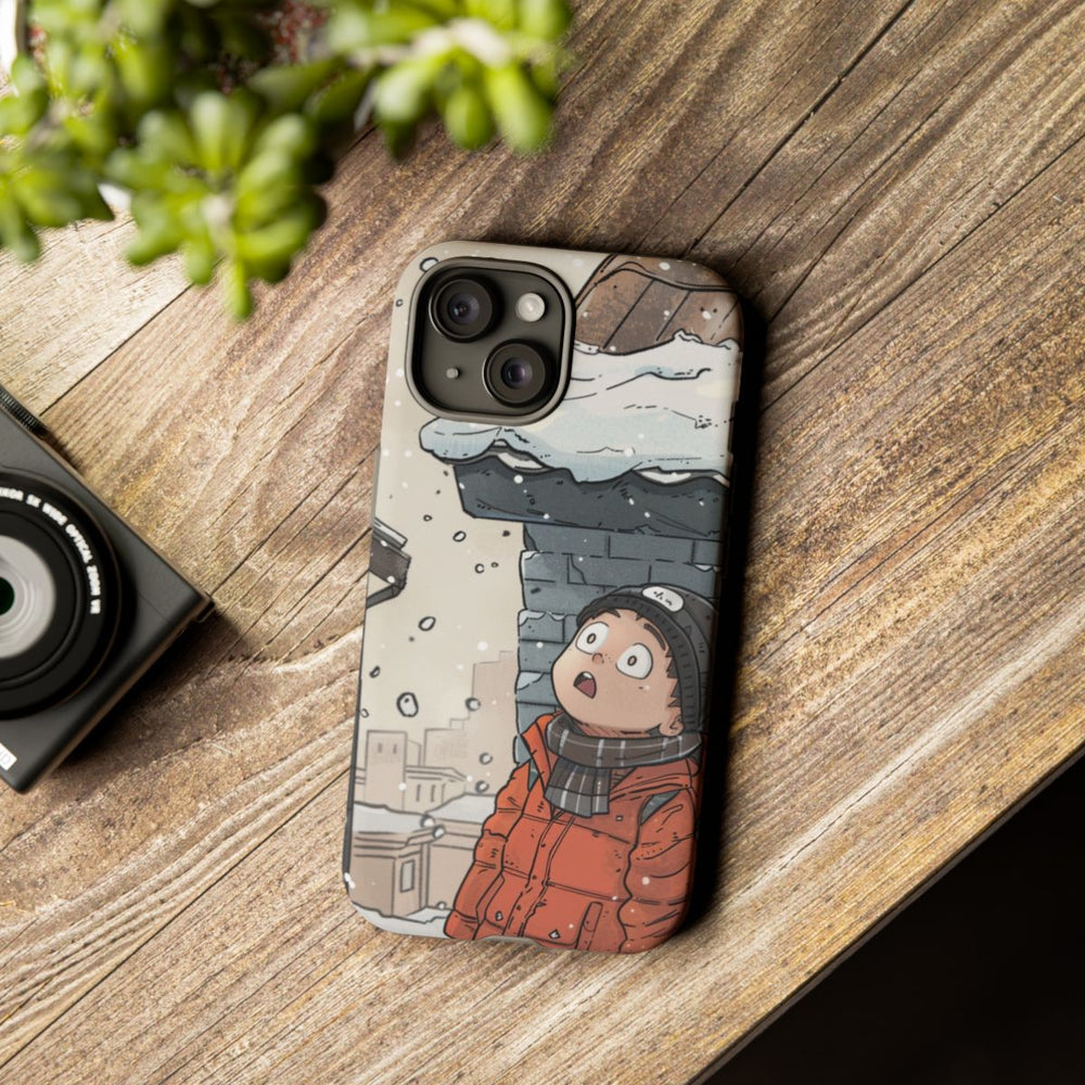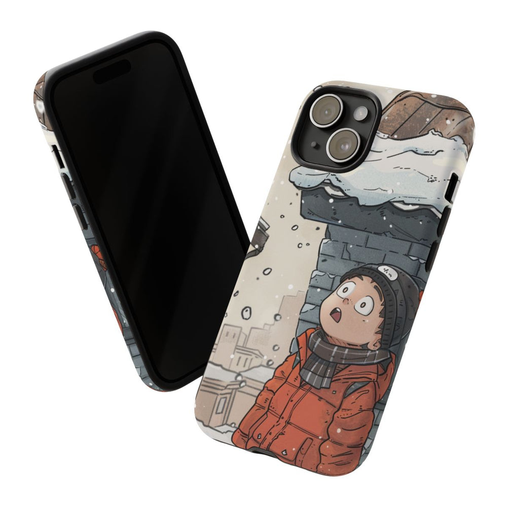 Dit hoesje toont een chibi-man in een oranje gewatteerde winterjas, een donkere muts met rode pompon en een geruite sjaal. Hij staat buiten bij een bakstenen gebouw met een met sneeuw bedekt dak. Zachte sneeuwvlokken dwarrelen om hem heen terwijl hij met een verbaasde blik omhoog kijkt. Op de achtergrond is een rustige winterse stad te zien onder een bewolkte lucht. Het hoesje bestaat uit twee stevige lagen van polycarbonaat en TPU en is geschikt voor draadloos opladen.
