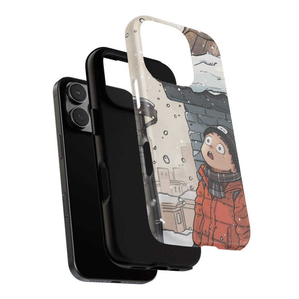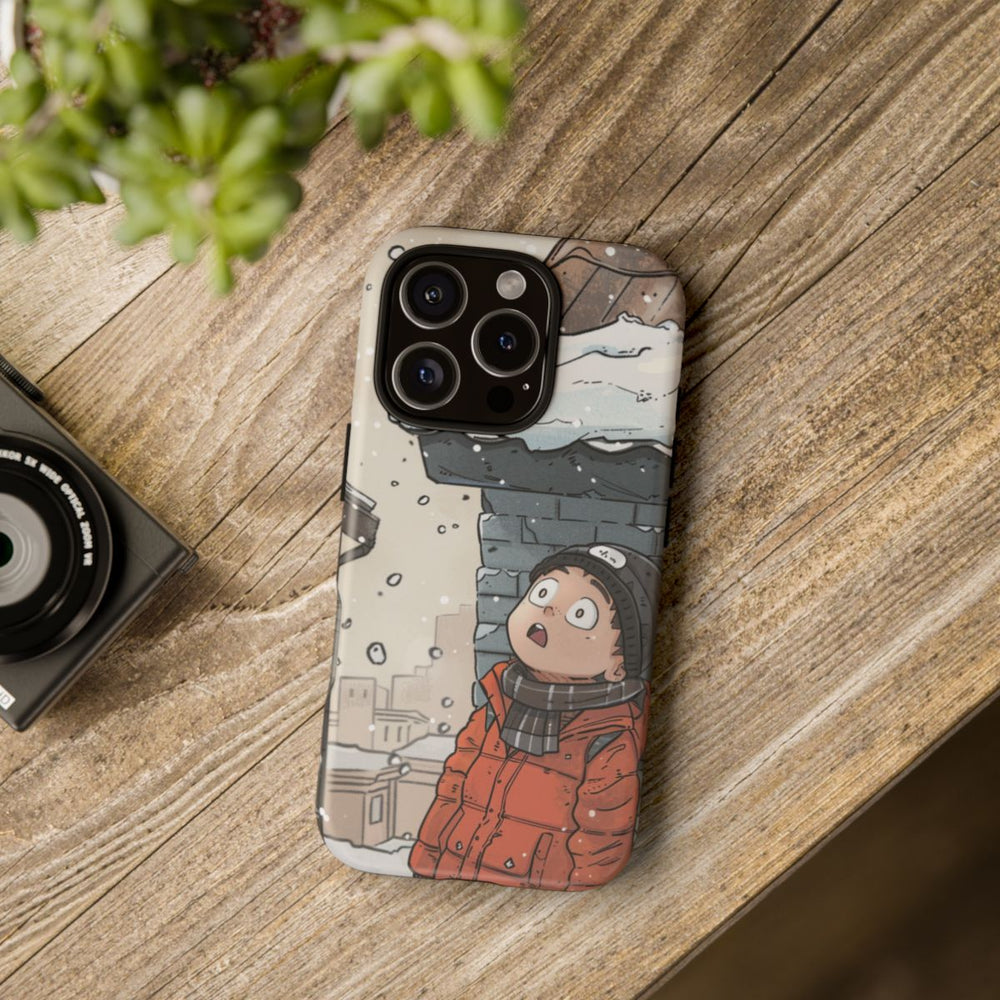 Deze illustratie toont een chibi-stijl man van middelbare leeftijd met een gewatteerde oranje winterjas, een donkere muts met rode pompon, een grijs geruite sjaal en handschoenen. Hij staat buiten bij een met sneeuw bedekt dak van een oud bakstenen gebouw en kijkt met een verbaasde blik omhoog. Zachte sneeuwvlokken dwarrelen naar beneden tegen een bewolkte lucht. Dit matte, stevige telefoonhoesje heeft een dubbele laag van polycarbonaat en TPU, is duurzaam en ondersteunt draadloos opladen.