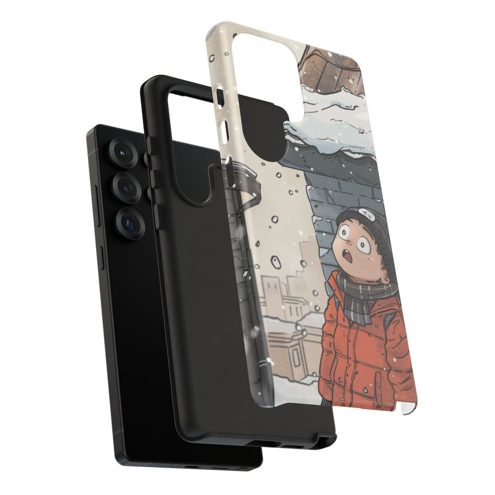 Deze illustratie toont een man in chibi-stijl met een oranje gewatteerde winterjas, een grijze sjaal en een donkere muts met een oranje pompon. Hij staat buiten bij een grijs bakstenen gebouw en kijkt met een verbaasde blik omhoog. Zachte sneeuwvlokken dwarrelen om hem heen en het dak boven hem is bedekt met sneeuw. Op de achtergrond is een ingetogen winterse stadsgezicht te zien onder een bewolkte lucht. Dit ontwerp is bedrukt op een matte, stevige telefoonhoesje met dubbele laag, geschikt voor de Galaxy S25 Ultra.
