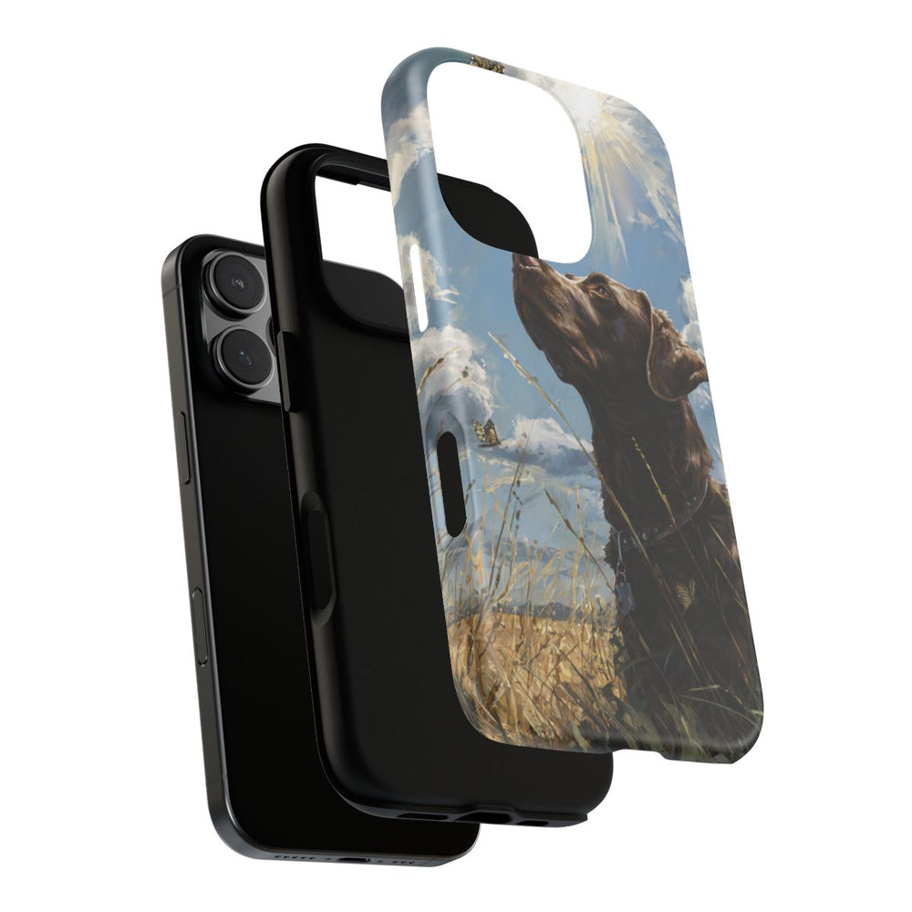 Dit hoesje toont een chocoladekleurige labrador die in hoog gras zit onder een heldere, deels bewolkte lucht. De hond kijkt omhoog naar de zon, die door de wolken schijnt en lichtstralen verspreidt. Rondom de hond fladderen verschillende vlinders, wat zorgt voor een levendige en natuurlijke sfeer. De afbeelding is rijk aan natuurlijke kleuren en details en straalt rust uit. Het matte hoesje bestaat uit een stevige polycarbonaat buitenkant en een TPU binnenzijde, waardoor je toestel optimaal beschermd is. Geschikt voor draadloos opladen.