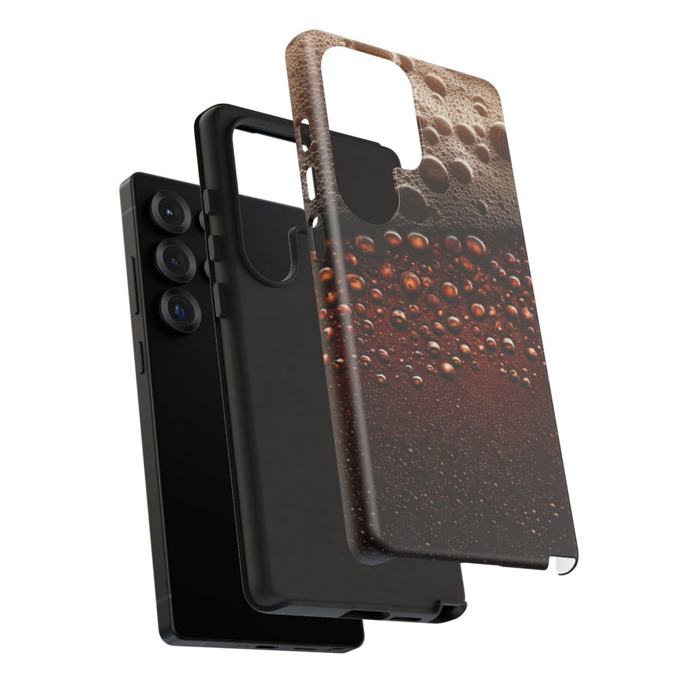 Dit ontwerp toont een close-up van donkerbruin bier met gedetailleerde belletjes en een dikke laag wit schuim bovenop. De afbeelding brengt de realistische structuur en bruisende uitstraling van het bieroppervlak mooi in beeld, wat zorgt voor een rijk en levendig visueel effect. Het telefoonhoesje heeft een dubbele laag met een matte afwerking, een polycarbonaat buitenkant en een TPU-binnenzijde voor extra stevigheid en bescherming. Geschikt voor draadloos opladen, maar niet compatibel met MagSafe.