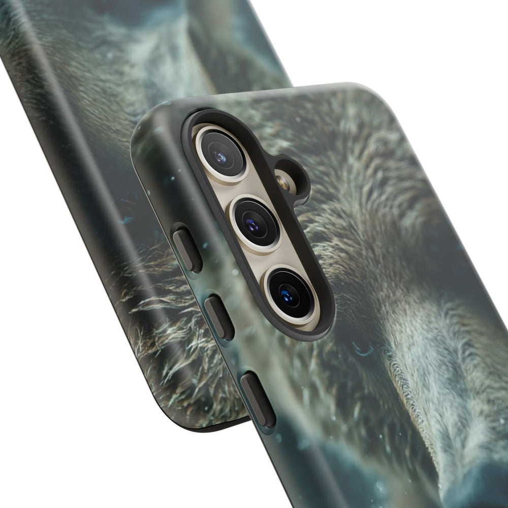 Dit hoesje toont een close-up van een bruine beer met natte vacht, omringd door opspattende waterdruppels. Het gezicht van de beer is gedetailleerd weergegeven, met zichtbare ogen, neus en open bek. De achtergrond is onscherp en heeft een koele, donkere tint, waardoor de beer en het bewegende water extra opvallen. Het matte en stevige hoesje heeft een dubbele laag van polycarbonaat en TPU. Ondersteunt draadloos opladen, maar is niet geschikt voor MagSafe.