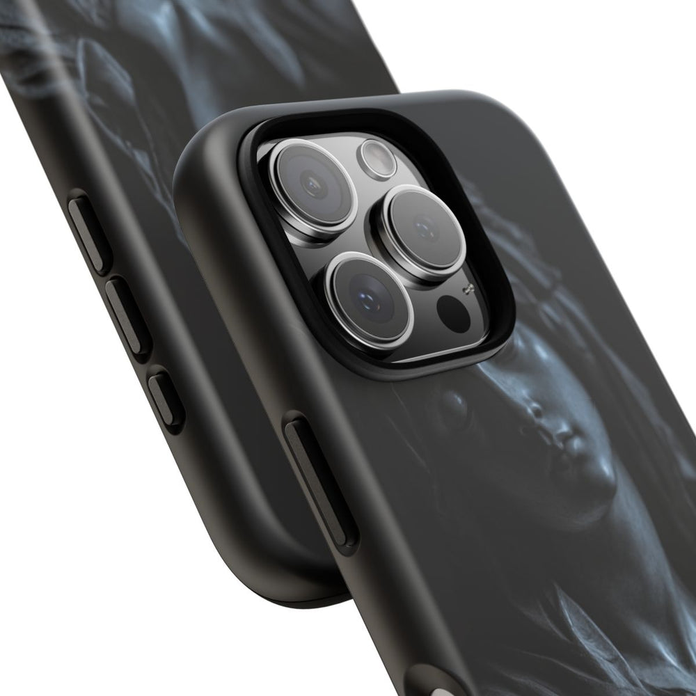 Dit telefoonhoesje toont een close-up van een marmeren beeld met een kalm gezicht, gesloten ogen en verfijnd gedrapeerde stof rond het hoofd en de schouders. De zachte verlichting tegen een donkere achtergrond accentueert de gladde structuur en de gedetailleerde plooien van het marmer. Het matte, stevige hoesje heeft een dubbele laag van polycarbonaat en TPU en is geschikt voor draadloos opladen.