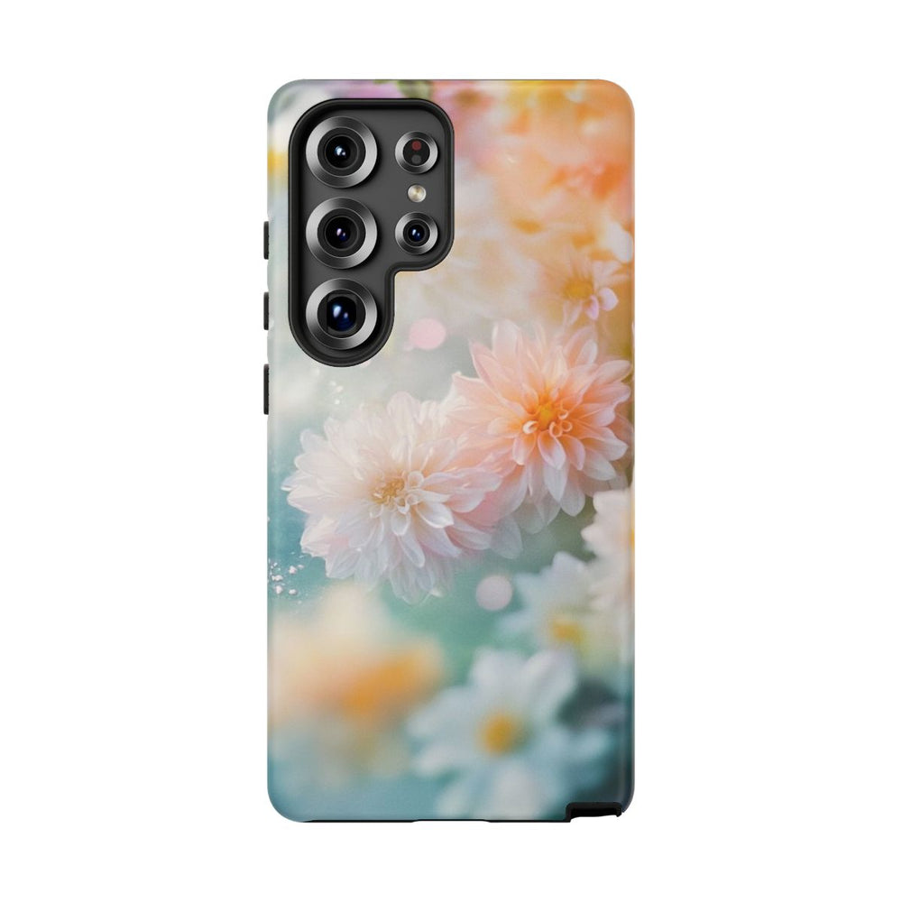 Dit hoesje heeft een prachtig ontwerp met een groep dahlia’s met veel bloemblaadjes in zachte pastelkleuren zoals wit, geel en subtiele tinten paars. De bloemen zijn duidelijk zichtbaar tegen een vervaagde achtergrond met een zachte bokeh, waardoor het geheel een rustige uitstraling krijgt. Natuurlijk licht laat de kleuren extra stralen, waardoor de bloemen fris en levendig lijken. Het hoesje bestaat uit twee lagen voor extra bescherming en is geschikt voor draadloos opladen.