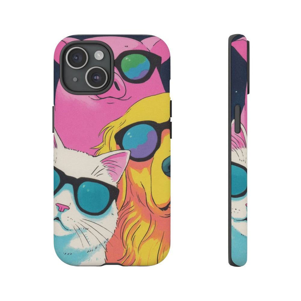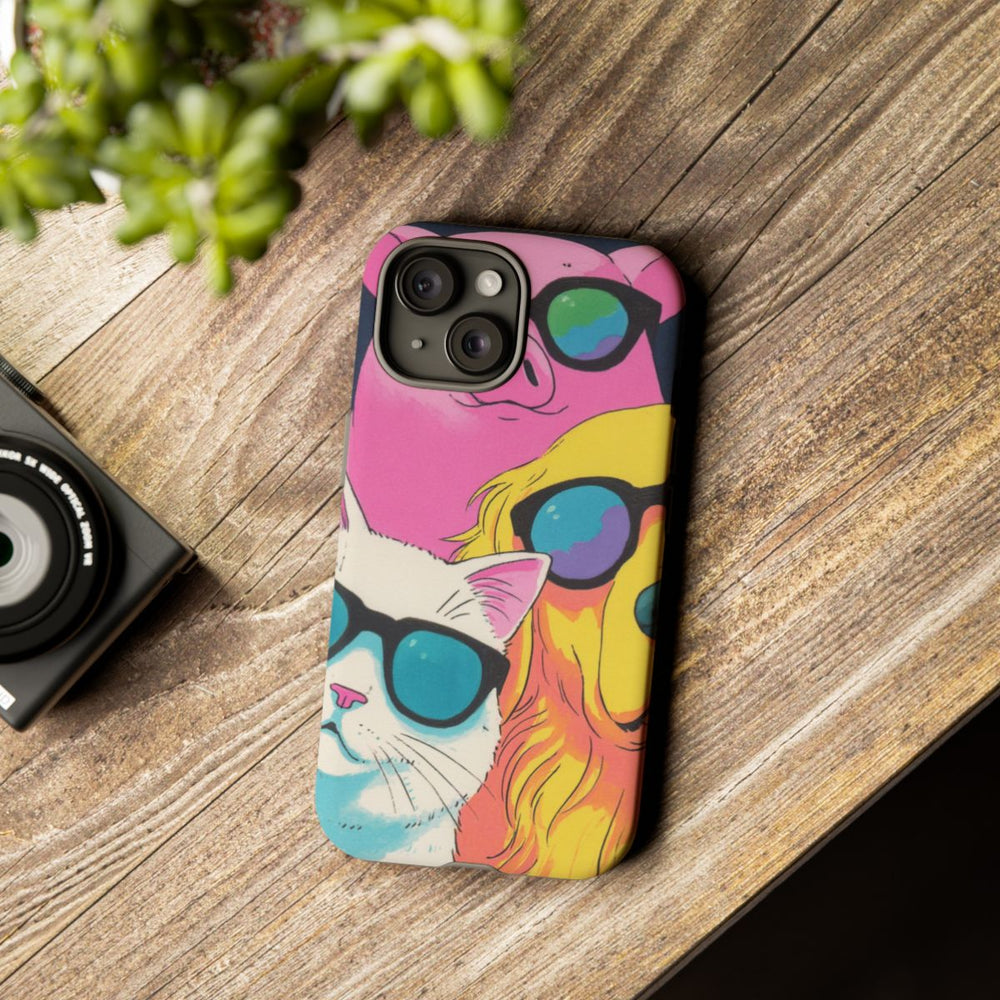 Dit telefoonhoesje heeft een kleurrijke illustratie van een varken, een kat en een hond, allemaal met zwarte zonnebrillen. Het varken is roze met regenboogkleuren in de glazen, de kat is wit met blauwgetinte glazen en de hond heeft geel en oranje vacht met paarse en blauwe reflecties in de bril. De donkere achtergrond is versierd met kleine witte stippen die op sterren lijken. Het hoesje bestaat uit twee lagen en is gemaakt van polycarbonaat en TPU, wat zorgt voor stevigheid en ondersteuning van draadloos opladen.