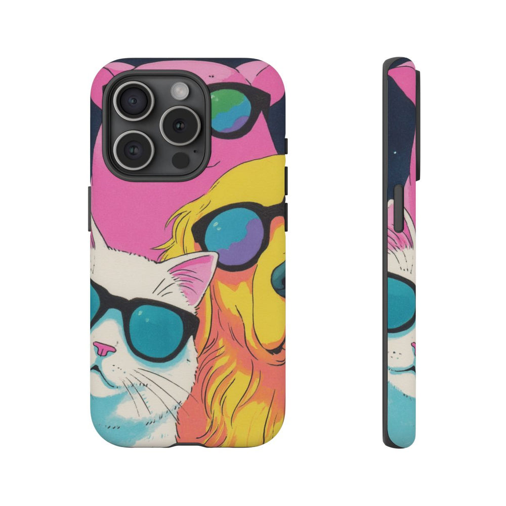 Dit ontwerp toont een roze varken, een witte kat en een goudkleurige hond, allemaal met zwarte zonnebrillen. In de glazen van de zonnebrillen zijn kleurrijke patronen te zien, wat het geheel een levendige uitstraling geeft. De achtergrond is donker met kleine witte stippen die doen denken aan sterren. De afbeelding is bedrukt op een mat telefoonhoesje met een stevige polycarbonaat buitenkant en TPU-binnenzijde, voor extra stevigheid en bescherming. Ondersteunt draadloos opladen, maar niet geschikt voor MagSafe.