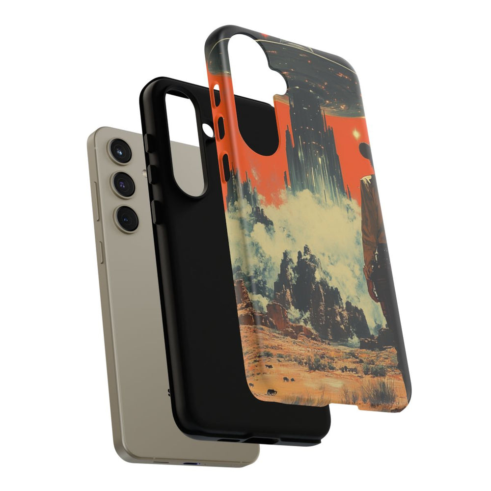 Dit hoesje toont een eenzame cowboy in een rotsachtig woestijnlandschap met hier en daar wat begroeiing. De cowboy draagt een hoed, laarzen en een holstergordel. Boven de woestijn zweeft een groot, futuristisch ruimteschip met lichtstralen, omgeven door mist en wolken. De lucht is fel oranje met verspreide sterren, wat zorgt voor een krachtig contrast met de donkere rotsformaties. Het hoesje heeft een dubbele laag met een matte afwerking, een stevige polycarbonaat buitenkant en een TPU-binnenzijde. Geschikt voor draadloos opladen.