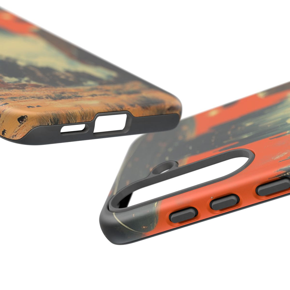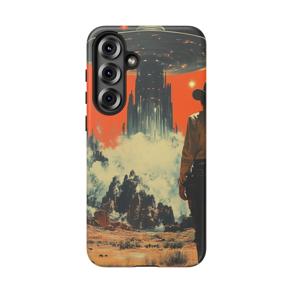 Dit hoesje toont een eenzame cowboy die in een woestijnlandschap staat, omringd door rotsformaties en spaarzame begroeiing. De cowboy draagt een hoed en laarzen en kijkt uit naar een groot, futuristisch UFO-achtig object dat boven een hoge, verlichte structuur zweeft, gehuld in mist. De lucht is feloranje met verspreide sterren. Het hoesje heeft een dubbele laag met een stevige polycarbonaat buitenkant en een TPU-binnenzijde, en ondersteunt draadloos opladen.