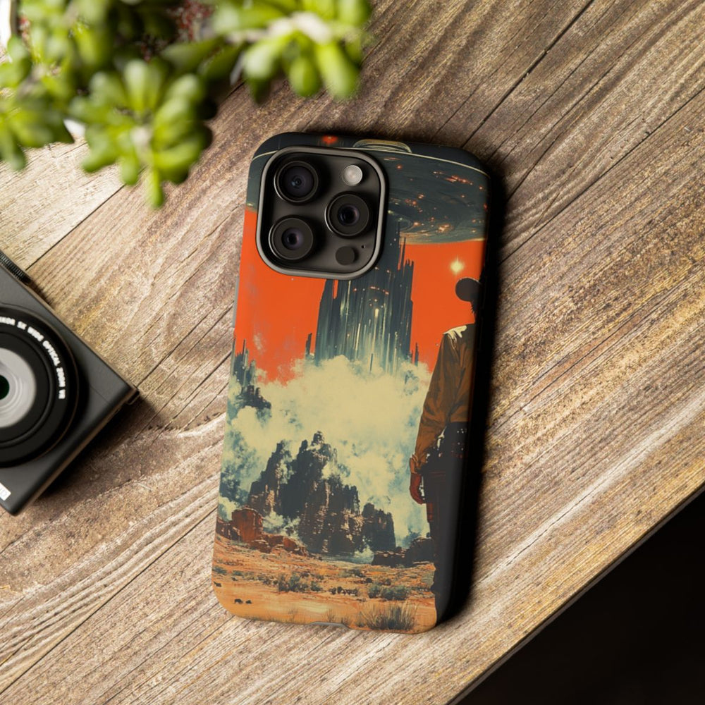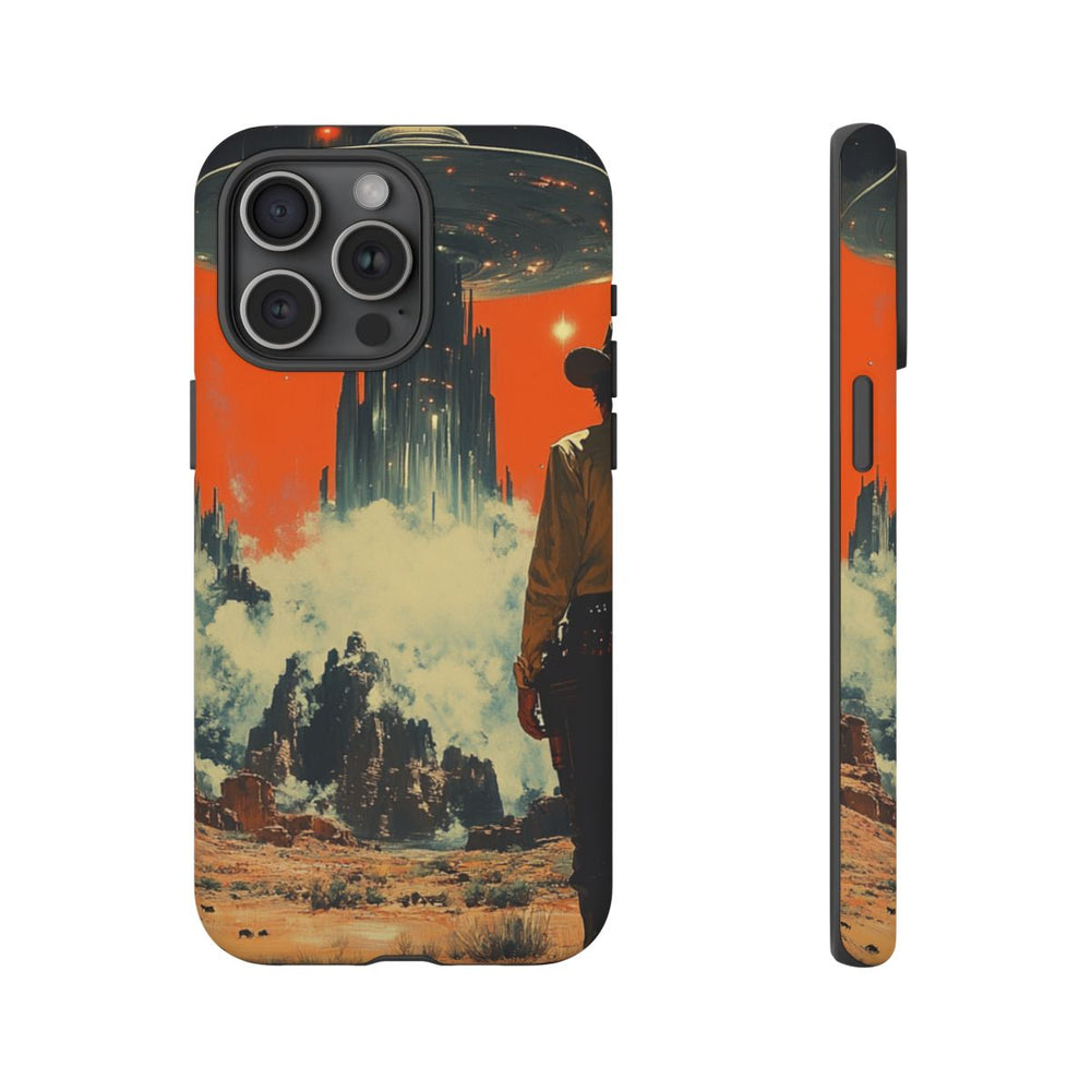 Dit hoesje toont een eenzame cowboy in een rotsachtig woestijnlandschap met spaarzame begroeiing. De cowboy draagt een hoed, laarzen en een riem met holsters. Op de achtergrond zweeft een groot futuristisch UFO boven hoge rotsformaties, omgeven door mist. De lucht is feloranje met verspreide sterren, wat zorgt voor een krachtig contrast met het donkere, rotsachtige terrein. Het hoesje bestaat uit twee lagen: een stevige polycarbonaat buitenkant en een TPU-binnenzijde, en ondersteunt draadloos opladen.