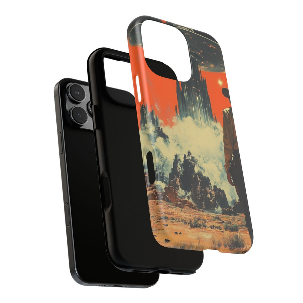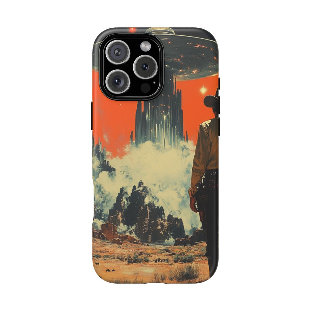 Dit hoesje heeft een ontwerp van een eenzame cowboy in een ruig woestijnlandschap met rotsachtige formaties en spaarzame begroeiing. Op de achtergrond zweeft een groot, futuristisch UFO boven een mistig gebied met hoge bouwwerken eronder. De lucht is fel oranje met verspreide sterren, wat zorgt voor een opvallend contrast. Het hoesje is gemaakt van een polycarbonaat buitenkant en een TPU binnenzijde voor extra stevigheid en ondersteunt draadloos opladen.