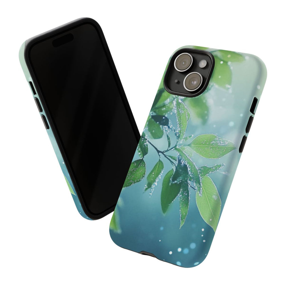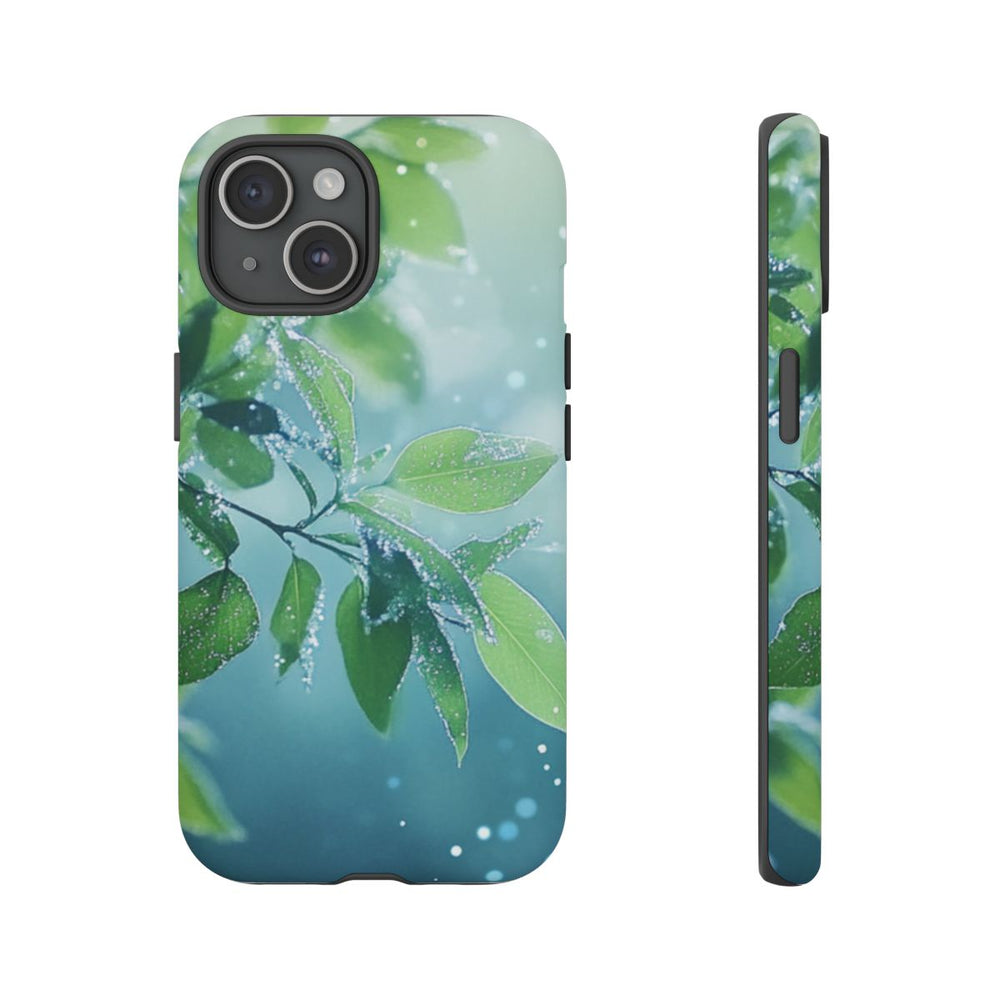 Dit hoesje is voorzien van een ontwerp met groene bladeren van dichtbij, bedekt met fijne dauwdruppels voor een frisse en natuurlijke uitstraling. De achtergrond is zacht vervaagd in lichtblauwe en groene tinten, aangevuld met kleine witte bokeh-vlekjes die doen denken aan lichtreflecties of nevel. Het matte hoesje heeft een dubbele laag van polycarbonaat en TPU, wat zorgt voor extra stevigheid en geschikt is voor draadloos opladen.
