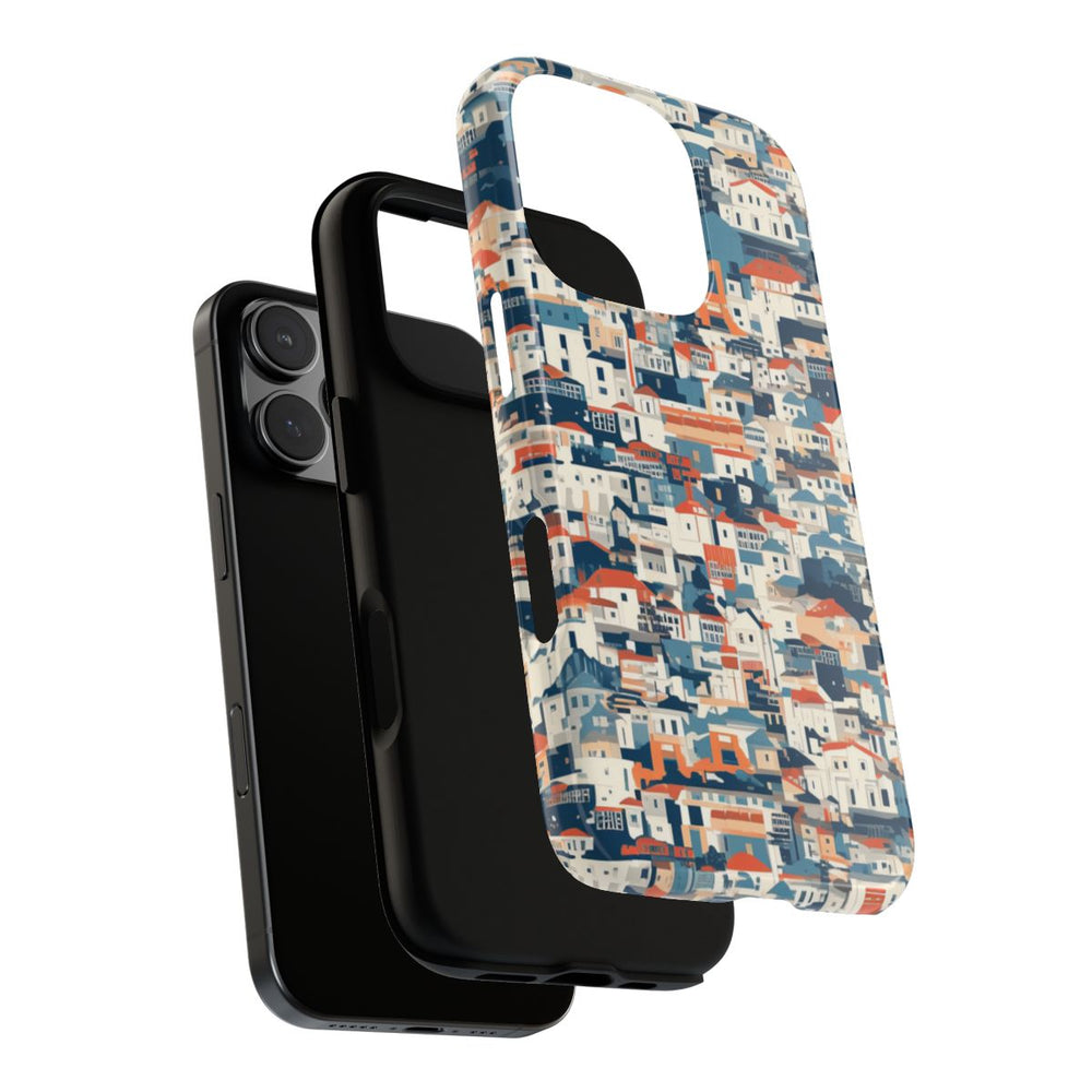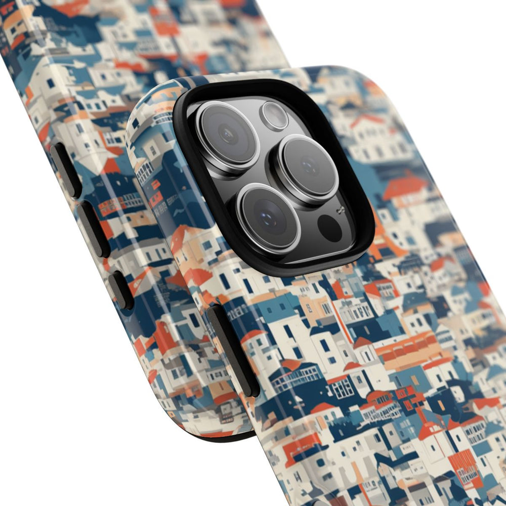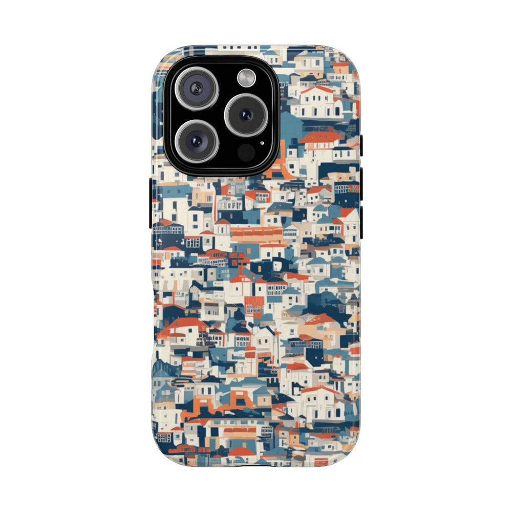 Dit hoesje is voorzien van een dicht, naadloos patroon van gestileerde stadswoningen die strak tegen elkaar aan staan. De huizen zijn afgebeeld in een eenvoudige, abstracte stijl met vlakke kleuren zoals blauw, wit, beige en daken in oranje-rood. Het patroon zorgt voor een gelaagd en levendig effect, waarbij verschillende ramen en dakvormen steeds terugkomen. Het glanzende, stevige hoesje bestaat uit een dubbele laag met een polycarbonaat buitenkant en een TPU binnenzijde. Het hoesje ondersteunt draadloos opladen en is bestand tegen weersinvloeden.