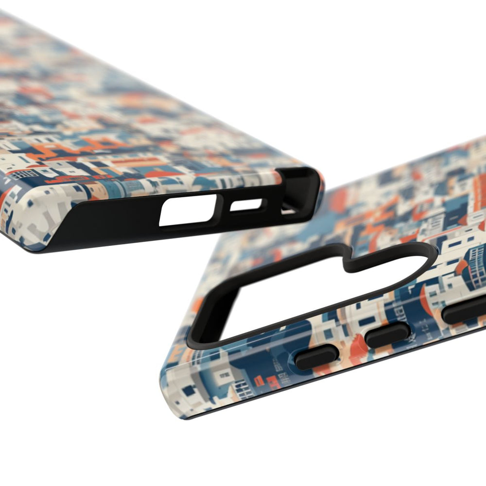 Dit hoesje is voorzien van een dicht, naadloos patroon van gestileerde stadswoningen die strak tegen elkaar aan staan. De huizen zijn afgebeeld in een eenvoudige, abstracte stijl met vlakke kleuren zoals blauw, wit, beige en daken in oranje-rood. Het patroon zorgt voor een gelaagd en levendig effect, waarbij verschillende ramen en dakvormen steeds terugkomen. Het glanzende, stevige hoesje bestaat uit een dubbele laag met een polycarbonaat buitenkant en een TPU binnenzijde. Het hoesje ondersteunt draadloos opladen en is bestand tegen weersinvloeden.