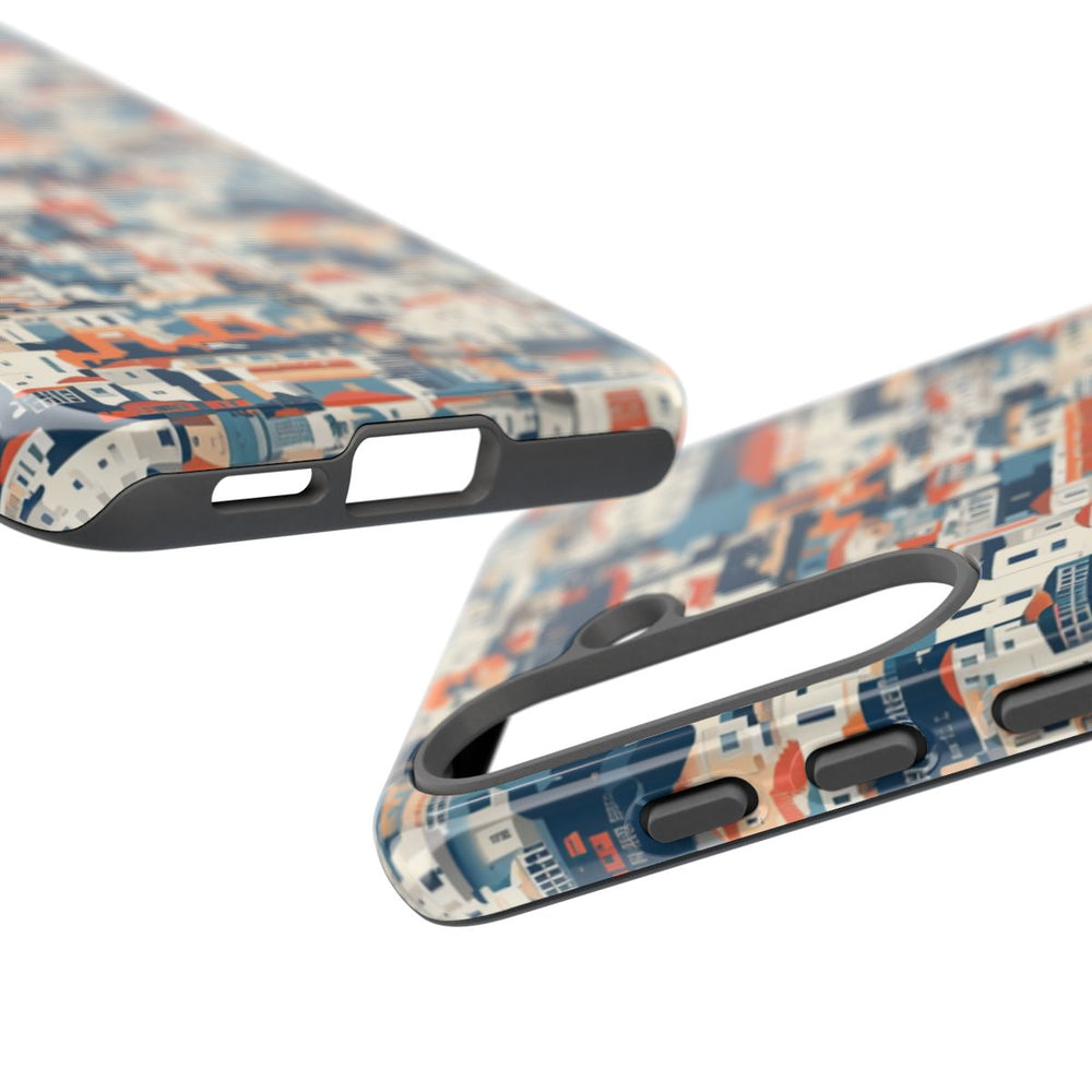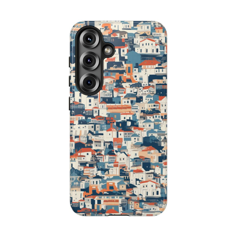 Dit hoesje is voorzien van een dicht, naadloos patroon van gestileerde stadswoningen die strak tegen elkaar aan staan. De huizen zijn afgebeeld in een eenvoudige, abstracte stijl met vlakke kleuren zoals blauw, wit, beige en daken in oranje-rood. Het patroon zorgt voor een gelaagd en levendig effect, waarbij verschillende ramen en dakvormen steeds terugkomen. Het glanzende, stevige hoesje bestaat uit een dubbele laag met een polycarbonaat buitenkant en een TPU binnenzijde. Het hoesje ondersteunt draadloos opladen en is bestand tegen weersinvloeden.