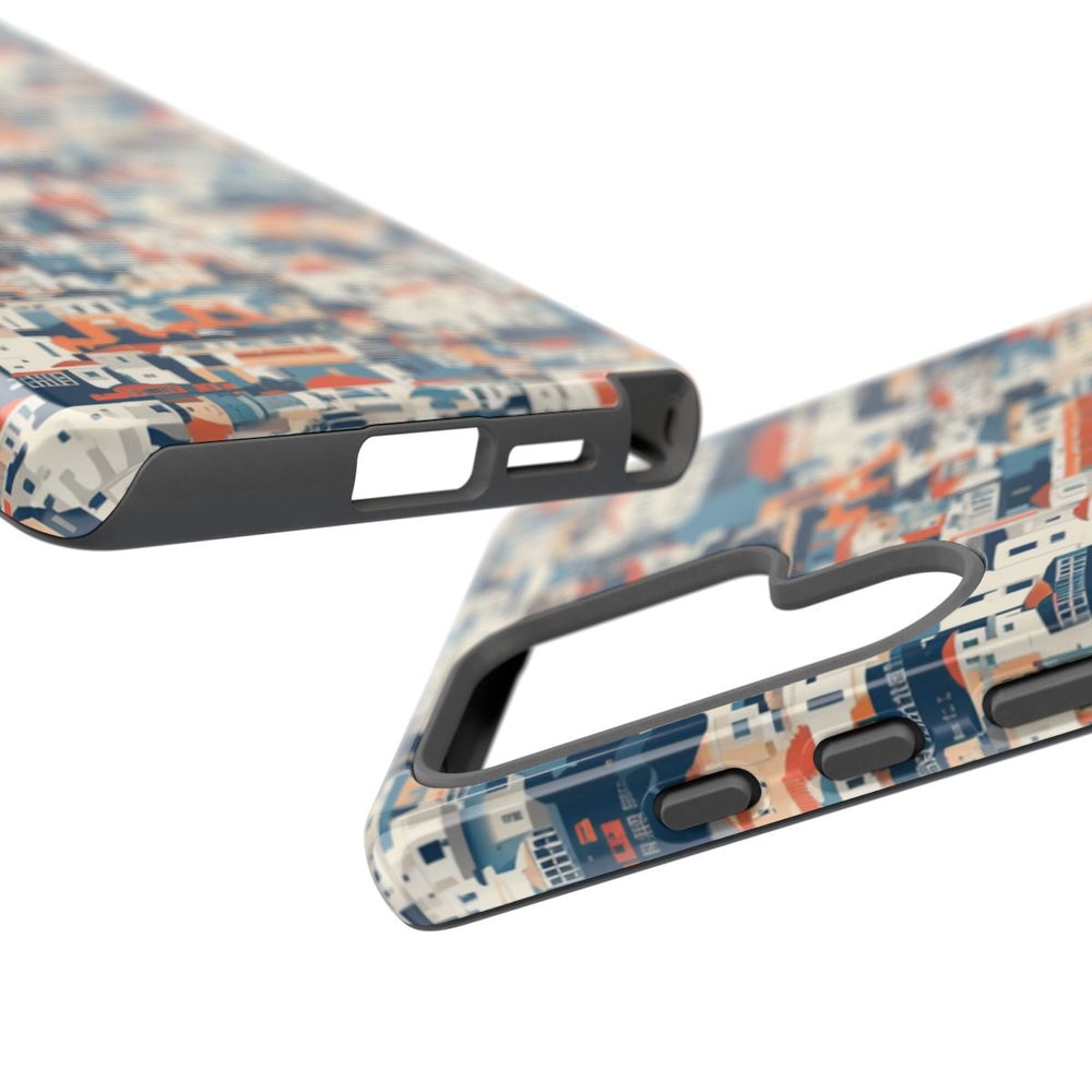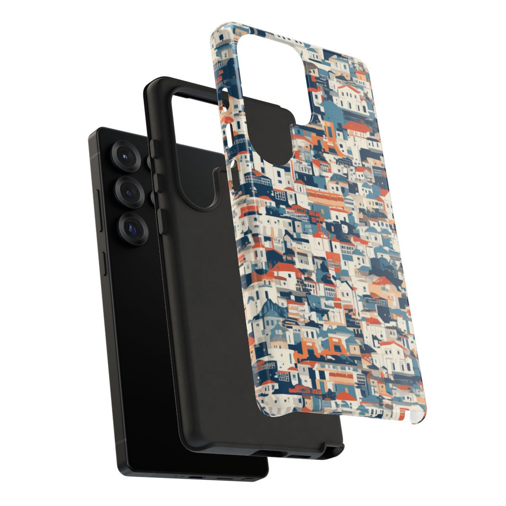Dit hoesje is voorzien van een dicht, naadloos patroon van gestileerde stadswoningen die strak tegen elkaar aan staan. De huizen zijn afgebeeld in een eenvoudige, abstracte stijl met vlakke kleuren zoals blauw, wit, beige en daken in oranje-rood. Het patroon zorgt voor een gelaagd en levendig effect, waarbij verschillende ramen en dakvormen steeds terugkomen. Het glanzende, stevige hoesje bestaat uit een dubbele laag met een polycarbonaat buitenkant en een TPU binnenzijde. Het hoesje ondersteunt draadloos opladen en is bestand tegen weersinvloeden.