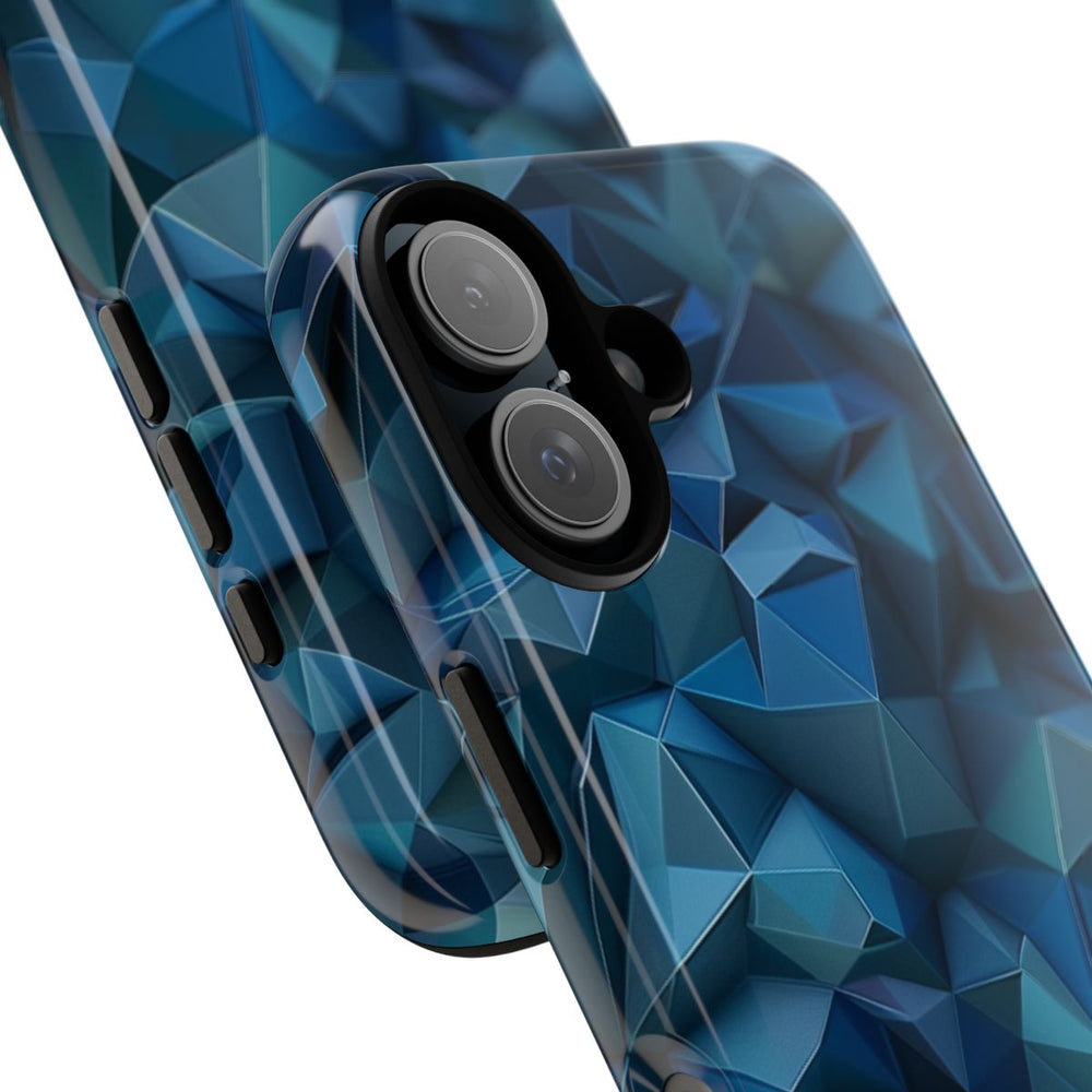 Dit telefoonhoesje is voorzien van een complex geometrisch patroon met polygonen in verschillende tinten diepblauw. De vormen zorgen voor een 3D-effect met scherpe randen en facetten, waardoor het geheel een gelaagde en gestructureerde uitstraling krijgt. Het patroon loopt naadloos en egaal over het hele oppervlak. Het hoesje heeft een glanzende afwerking en bestaat uit twee lagen, gemaakt van polycarbonaat en TPU voor extra stevigheid en bescherming. Geschikt voor draadloos opladen en bestand tegen invloeden van buitenaf.