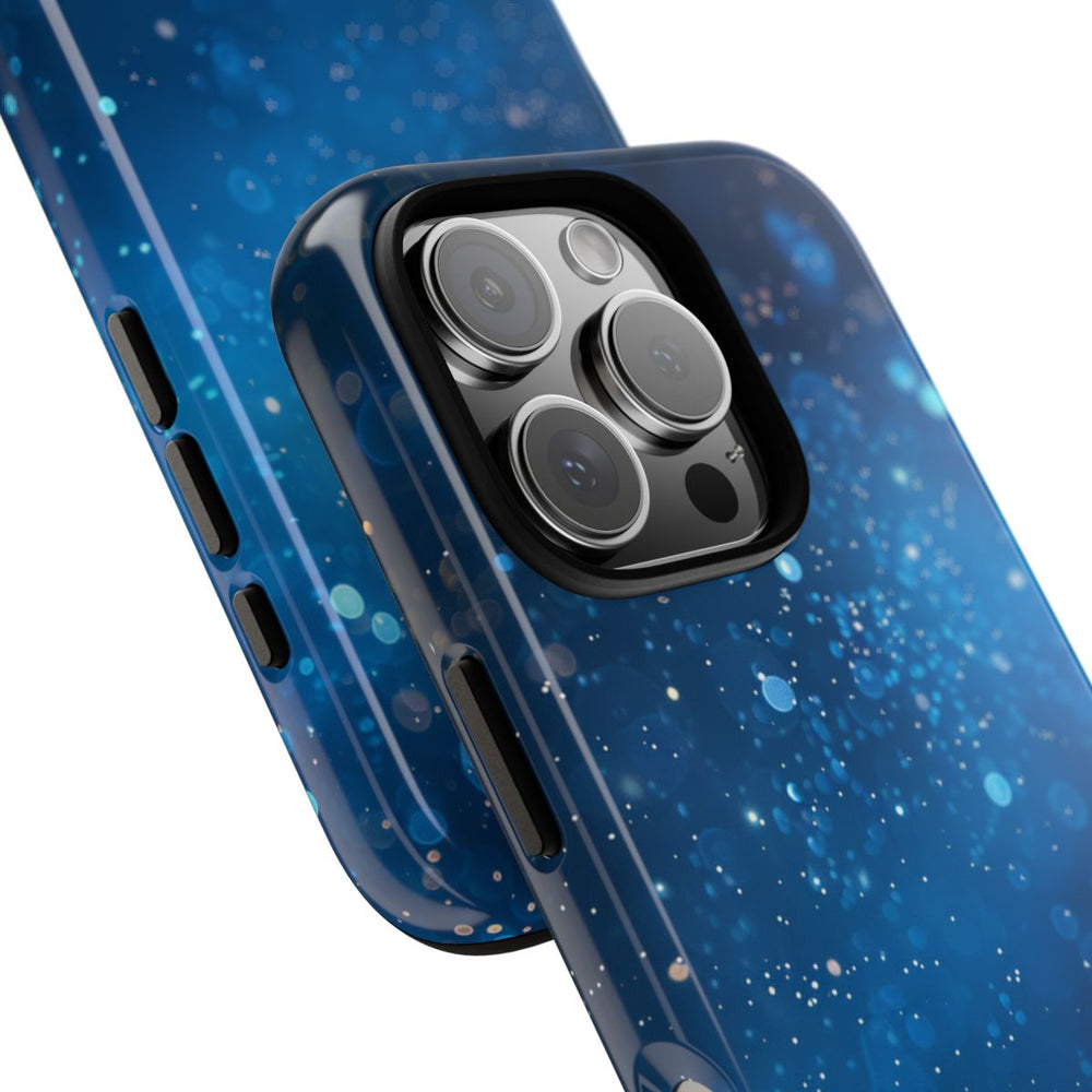 Dit telefoonhoesje heeft een diepblauwe achtergrond met talloze zachte, lichtgevende bollen en fonkelende accenten die speels over het ontwerp verspreid zijn. De lichten verschillen in grootte en helderheid, wat zorgt voor een dromerig, glinsterend effect met subtiele glitterdeeltjes. Het geheel oogt stijlvol en minimalistisch, met een vloeiende kleurverloop die de luxe uitstraling versterkt. Het hoesje bestaat uit twee lagen van polycarbonaat en TPU voor extra bescherming en ondersteunt draadloos opladen.