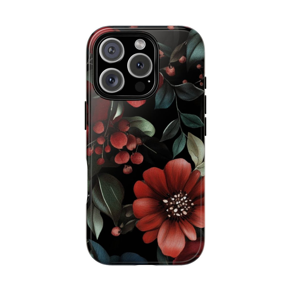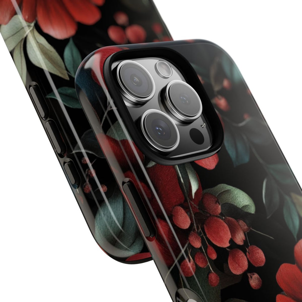 Dit hoesje heeft een verfijnd bloemenpatroon met dieprode en bordeauxrode bloemen, waaronder rozen en andere soorten, op een zwarte achtergrond. De bloemen worden omlijst door groene en blauwgroene bladeren en kleine rode besjes, wat zorgt voor een rijke en opvallende botanische uitstraling. Het patroon is gedetailleerd en gelijkmatig verdeeld, waardoor het perfect past bij dit glanzende, stevige hoesje met dubbele bescherming dankzij een polycarbonaat buitenkant en TPU binnenzijde. Het hoesje ondersteunt draadloos opladen en is bestand tegen invloeden van buitenaf.