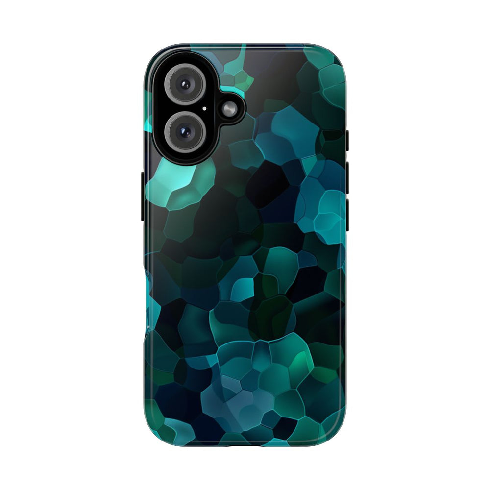 Dit hoesje is bedrukt met een abstract patroon van diverse geometrische vormen met een 3D-effect. De vormen verschillen in grootte en lopen naadloos in elkaar over, wat zorgt voor een vloeiend en dynamisch geheel. De kleuren bestaan vooral uit diepzeeblauw en turkoois, met heldere accenten voor extra diepte en contrast. Het patroon is aangebracht op een glanzend en stevig hoesje van polycarbonaat en TPU. Dankzij de dubbele laag biedt het hoesje optimale bescherming en is het geschikt voor draadloos opladen.