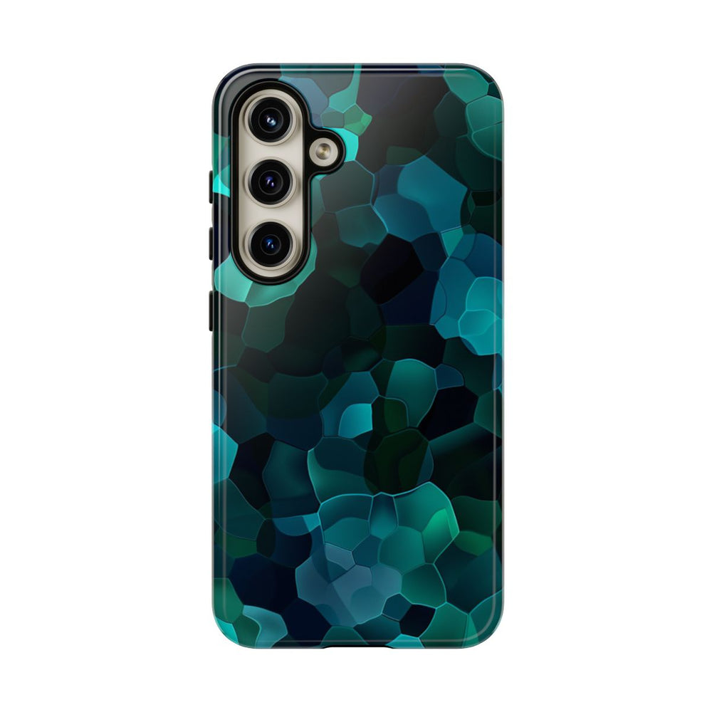 Dit hoesje is bedrukt met een abstract patroon van diverse geometrische vormen met een 3D-effect. De vormen verschillen in grootte en lopen naadloos in elkaar over, wat zorgt voor een vloeiend en dynamisch geheel. De kleuren bestaan vooral uit diepzeeblauw en turkoois, met heldere accenten voor extra diepte en contrast. Het patroon is aangebracht op een glanzend en stevig hoesje van polycarbonaat en TPU. Dankzij de dubbele laag biedt het hoesje optimale bescherming en is het geschikt voor draadloos opladen.