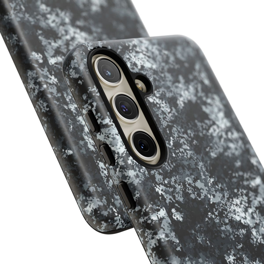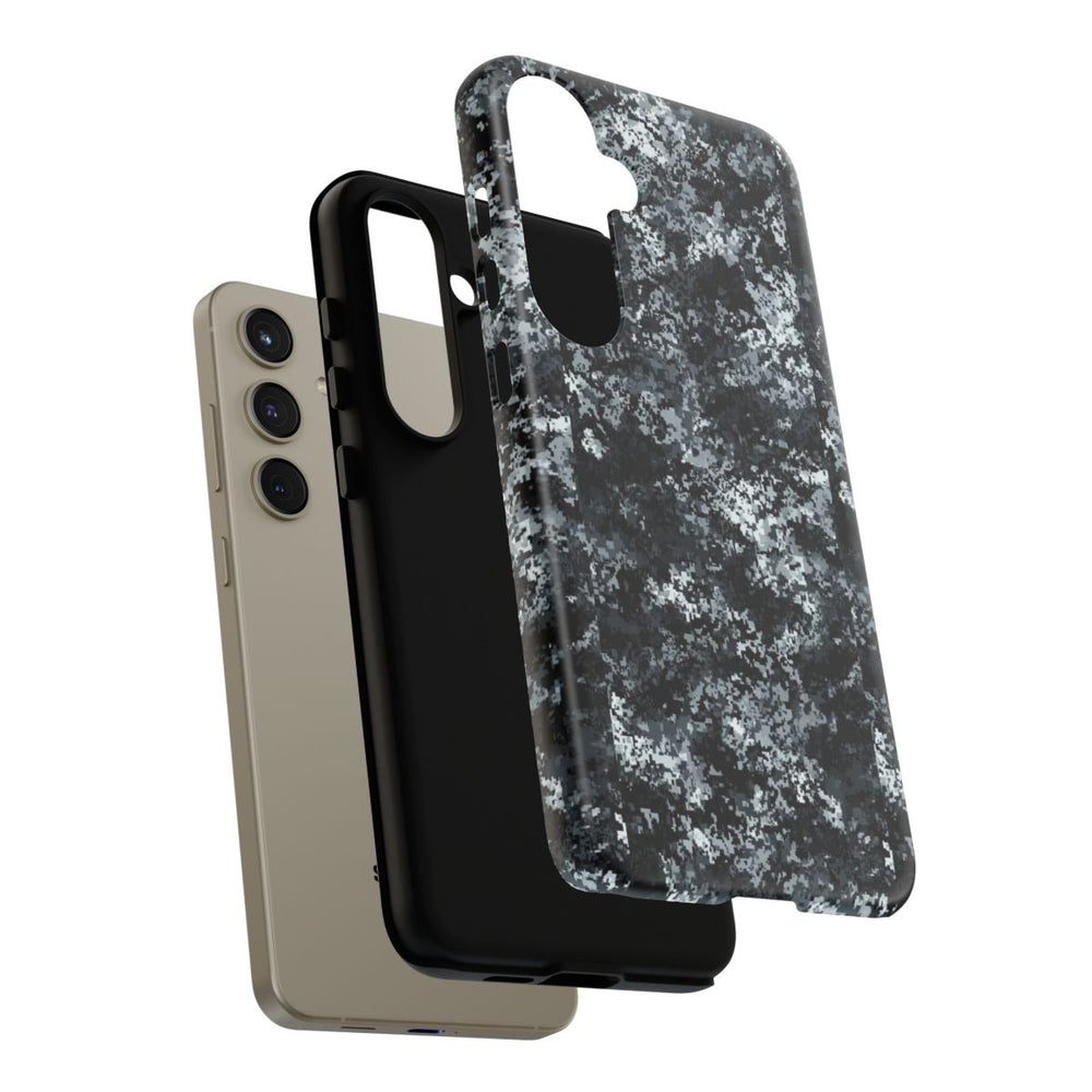 Dit hoesje heeft een digitaal camouflagepatroon met kleine, pixelachtige vormen in verschillende tinten grijs, zwart en wit. Het patroon zorgt voor een abstracte, getextureerde uitstraling waarin lichte en donkere vlakken mooi in elkaar overlopen. Het matte hoesje is extra stevig dankzij de dubbele laag van een polycarbonaat buitenkant en een TPU binnenzijde. Het biedt optimale bescherming, is geschikt voor draadloos opladen en bestand tegen weersinvloeden.