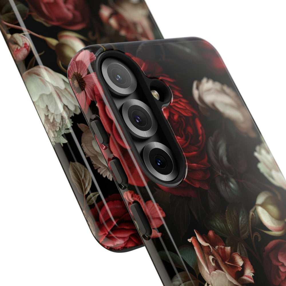 Dit hoesje is voorzien van een naadloos patroon met grote, gedetailleerde rozen en pioenen in tinten rood, wit en roze. De bloemen worden omringd door donkergroene en bruine bladeren op een bijna zwarte achtergrond. Deze samenstelling zorgt voor een rijke, mysterieuze en klassieke bloemenuitstraling. Het hoesje heeft een glanzende afwerking en bestaat uit twee lagen: een stevige polycarbonaat buitenkant en een TPU binnenzijde voor extra stevigheid en bescherming. Ondersteunt draadloos opladen. Niet geschikt voor MagSafe.
