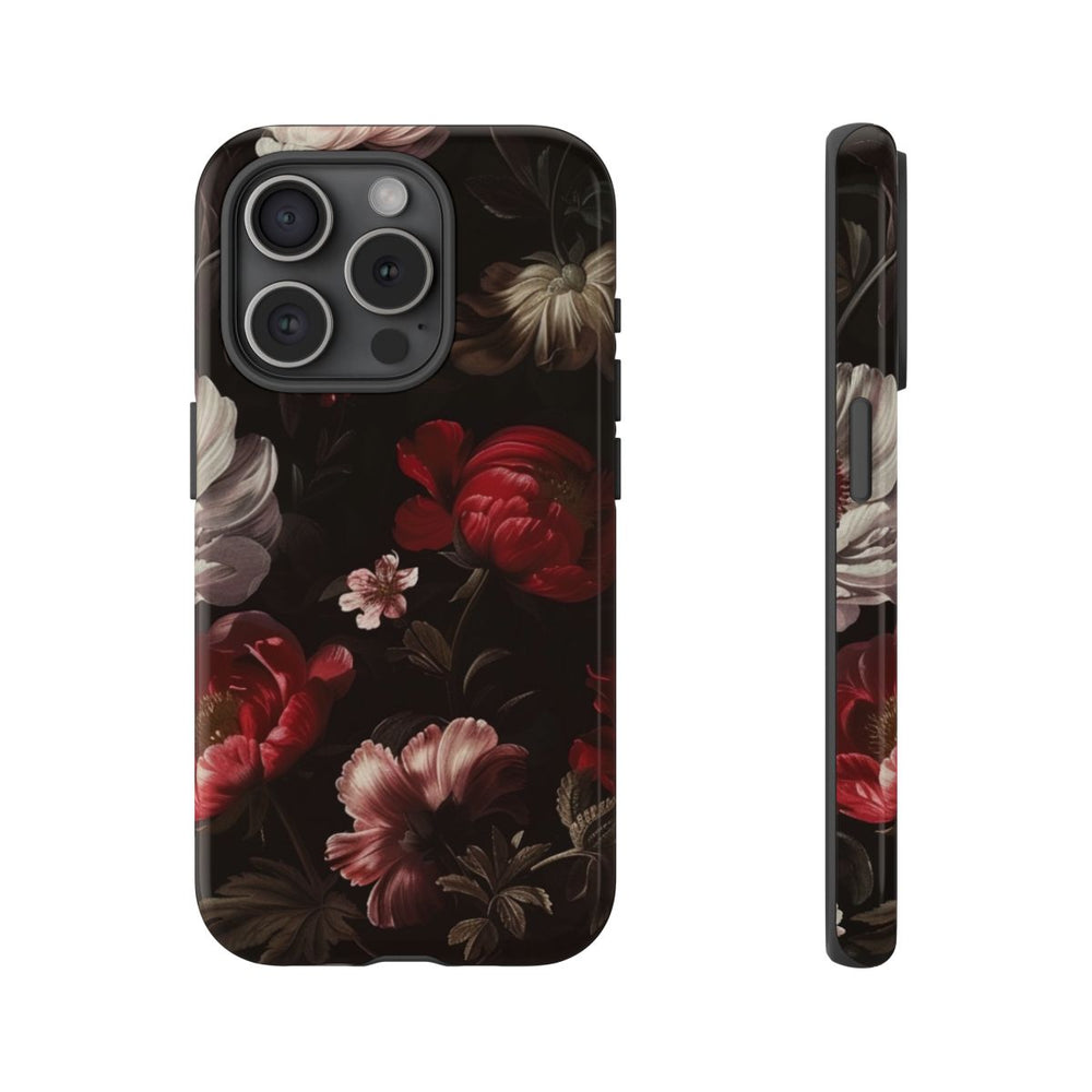Dit hoesje heeft een naadloos patroon van donkere, sfeervolle bloemen op een zwarte achtergrond. De bloemen zijn gedetailleerd uitgewerkt in diepe roodtinten, donkerroze en wit, wat zorgt voor een rijk en opvallend contrast. Het ontwerp bevat diverse bloemen, knoppen en verfijnde bladeren in gedempte kleuren. De stijl doet denken aan klassieke schilderijen van oude meesters, wat het hoesje een tijdloze en elegante uitstraling geeft. Dit glanzende, stevige hoesje bestaat uit twee lagen voor extra bescherming en duurzaamheid. Ondersteunt draadloos opladen.