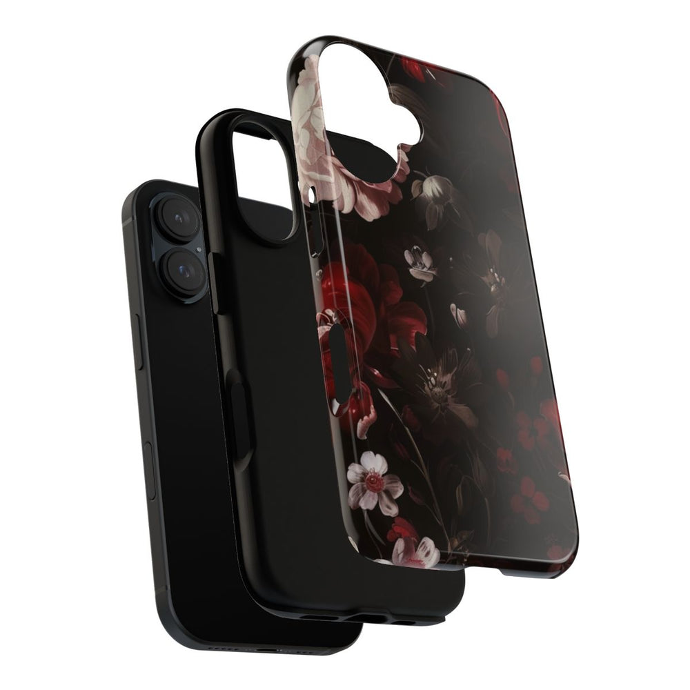 Dit hoesje heeft een naadloos patroon van grote, gedetailleerde bloemen in diepe roodtinten, donkerroze en wit op een zwarte achtergrond. De bloemen zijn uitgevoerd in een sfeervolle, klassieke stijl met verfijnde schaduwen en accenten, wat zorgt voor een rijk en dramatisch effect. Verschillende bloemsoorten, bladeren en knoppen zijn dicht op elkaar geplaatst, waardoor het hele oppervlak bedekt is. Het hoesje heeft een glanzende afwerking, een stevige polycarbonaat buitenkant en een TPU binnenlaag voor dubbele bescherming. Geschikt voor draadloos opladen.