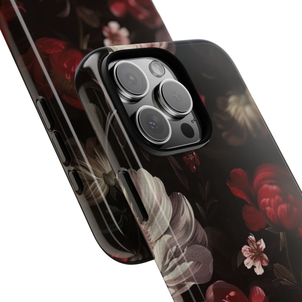 Dit hoesje heeft een naadloos patroon van donkere, sfeervolle bloemen op een zwarte achtergrond. De bloemen zijn gedetailleerd uitgewerkt in diepe roodtinten, donkerroze en wit, wat zorgt voor een rijk en opvallend contrast. Het ontwerp bevat diverse bloemen, knoppen en verfijnde bladeren in gedempte kleuren. De stijl doet denken aan klassieke schilderijen van oude meesters, wat het hoesje een tijdloze en elegante uitstraling geeft. Dit glanzende, stevige hoesje bestaat uit twee lagen voor extra bescherming en duurzaamheid. Ondersteunt draadloos opladen.