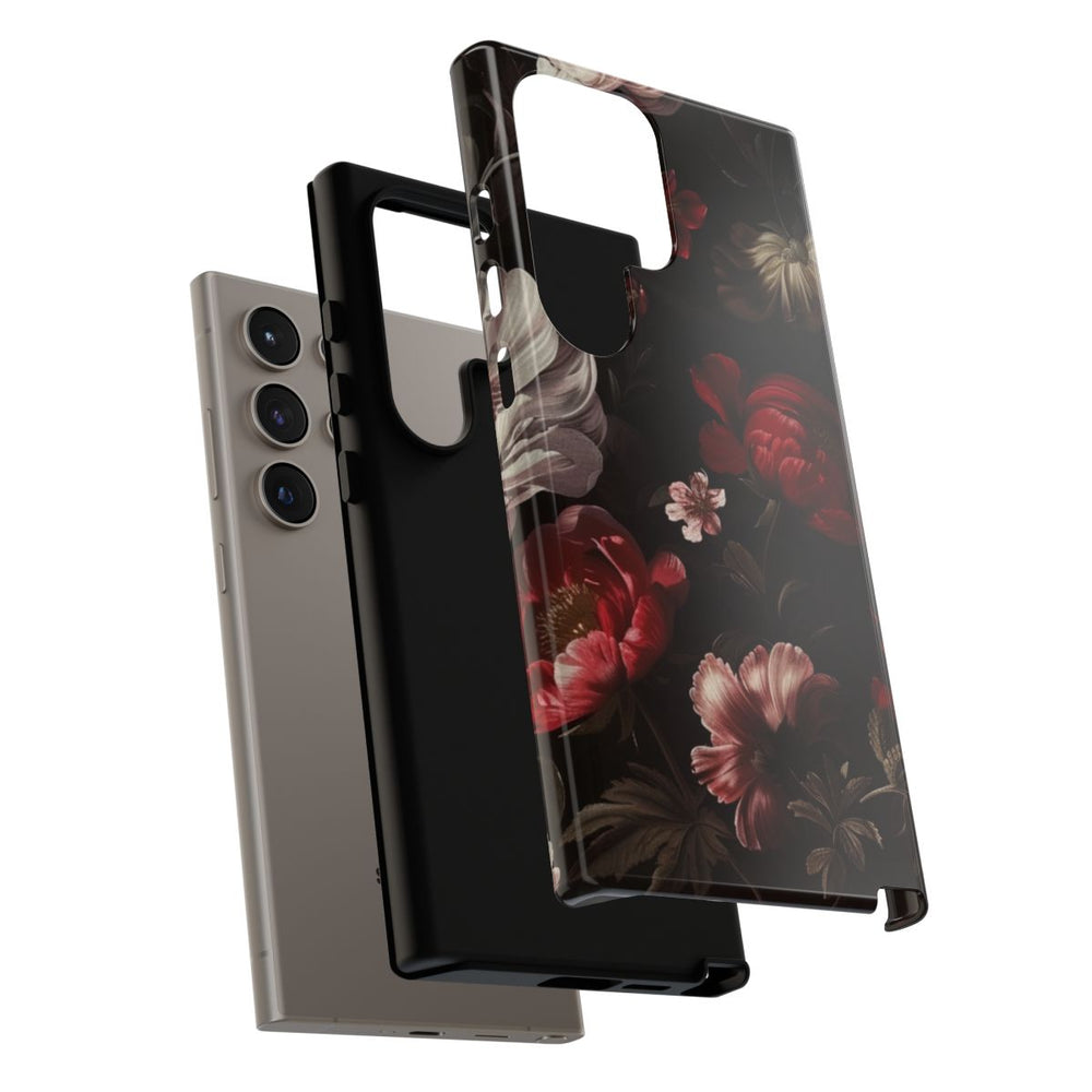 Dit hoesje heeft een naadloos patroon van donkere, sfeervolle bloemen op een zwarte achtergrond. De bloemen zijn gedetailleerd uitgewerkt in diepe roodtinten, donkerroze en wit, wat zorgt voor een rijk en opvallend contrast. Het ontwerp bevat diverse bloemen, knoppen en verfijnde bladeren in gedempte kleuren. De stijl doet denken aan klassieke schilderijen van oude meesters, wat het hoesje een tijdloze en elegante uitstraling geeft. Dit glanzende, stevige hoesje bestaat uit twee lagen voor extra bescherming en duurzaamheid. Ondersteunt draadloos opladen.